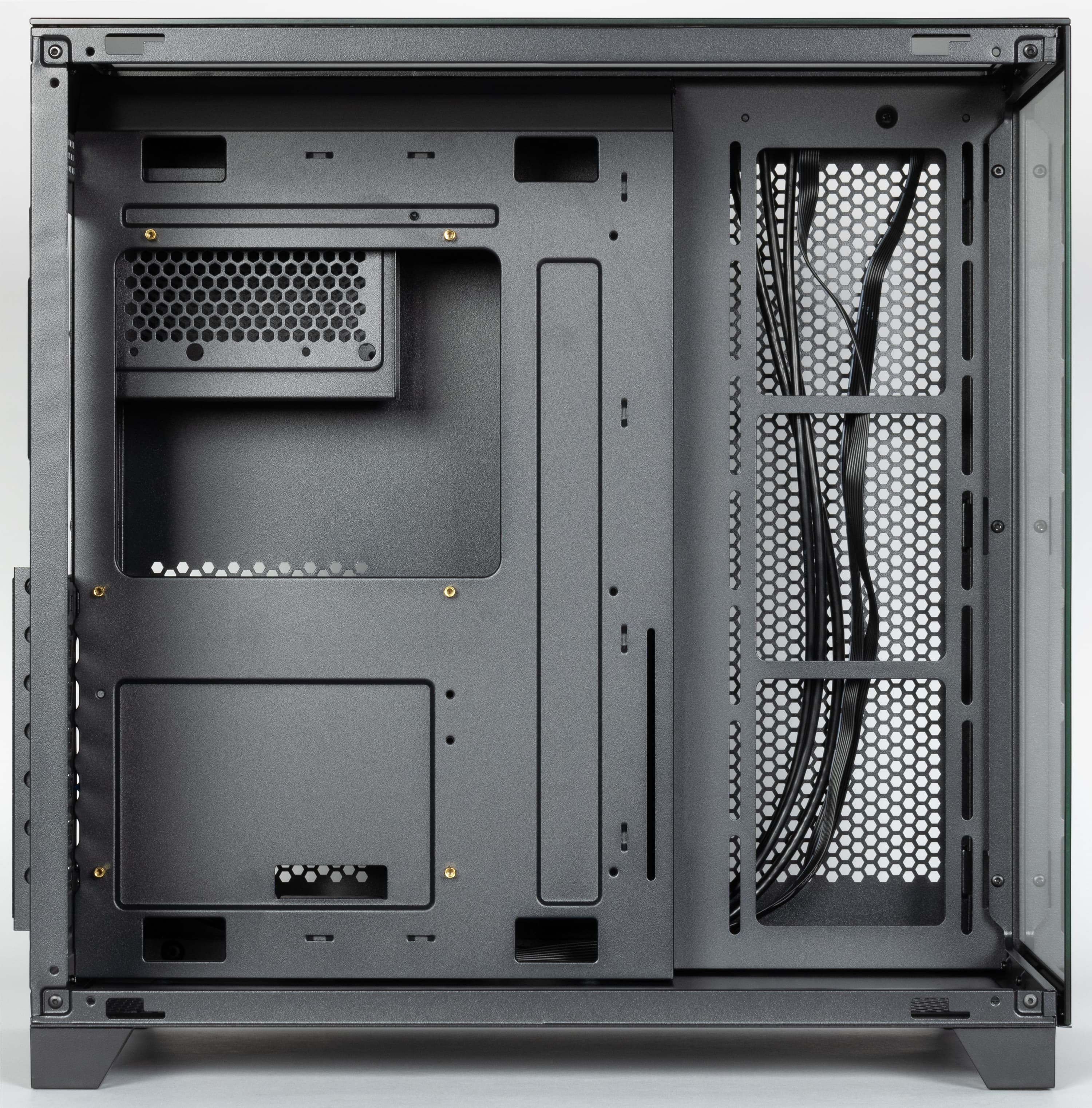 Объемы отделены друг от друга изогнутой перегородкой, которая в задней части является и основанием для системной платы, здесь у нее имеются прорези разного размера для кабелей, а ближе к лицевой стороне корпуса расположена решетка для установки вентиляторов или радиатора СЖО.