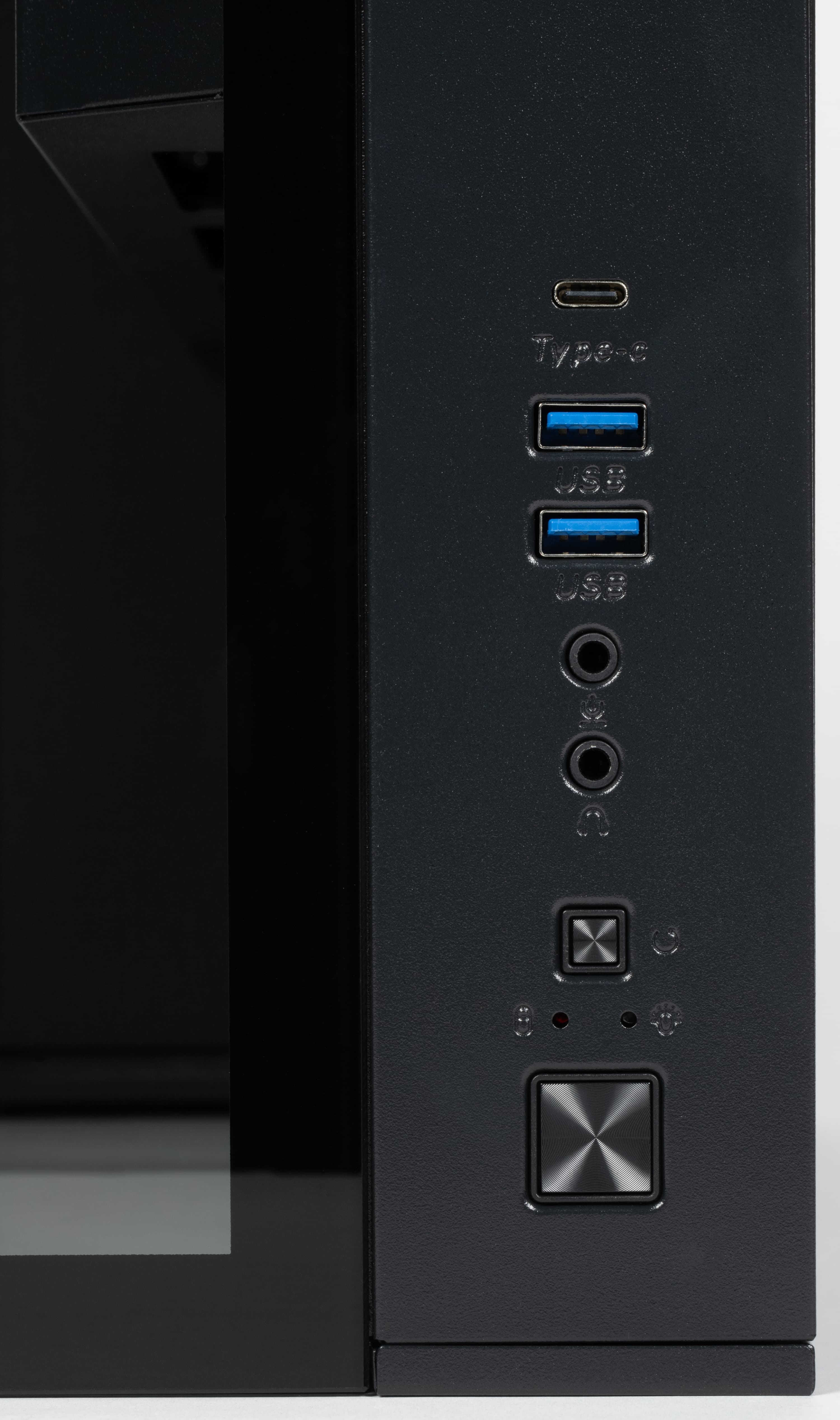 Интерфейсные разъемы и кнопки расположены в правой части верхней плоскости шасси ближе к лицевой панели. Имеются два порта USB Type-A и один USB Type-C (конечно, тех и других хотелось бы иметь побольше, но для корпуса с умеренной ценой и это вполне нормально), отдельные разъемы для подключения микрофона и наушников, два индикатора — включения и дисковой активности, небольшая кнопка перезагрузки, а также кнопка большего размера для включения. Усилие нажатия кнопок комфортное, свободный ход совсем небольшой, для Power нельзя исключить срабатывания от случайного прикосновения, а для Reset из-за ее размера подобное вряд ли возможно.