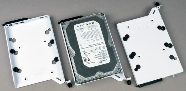 К универсальным салазкам накопители любой размерности крепятся винтами снизу, причем 2,5-дюймовые непосредственно к металлу салазок, а 3,5-дюймовые через резиновые амортизаторы.