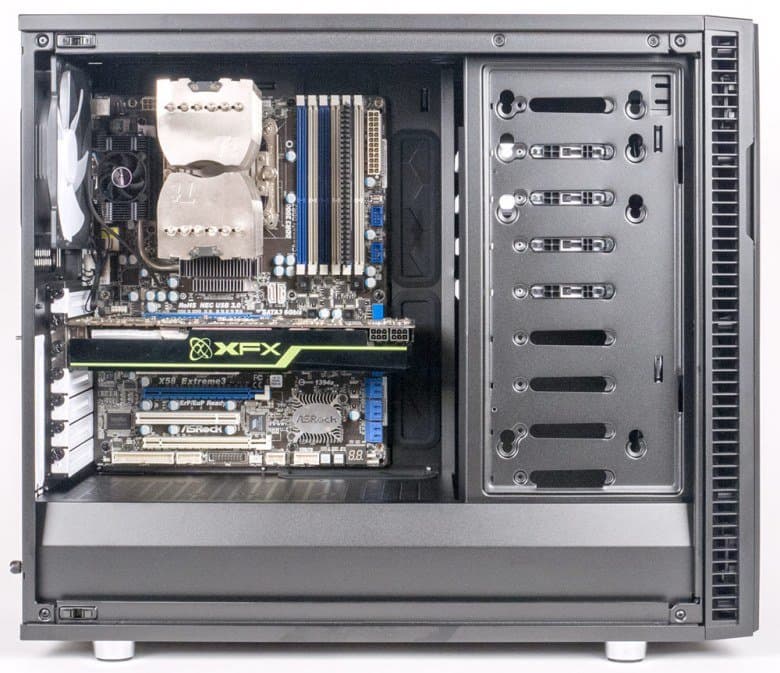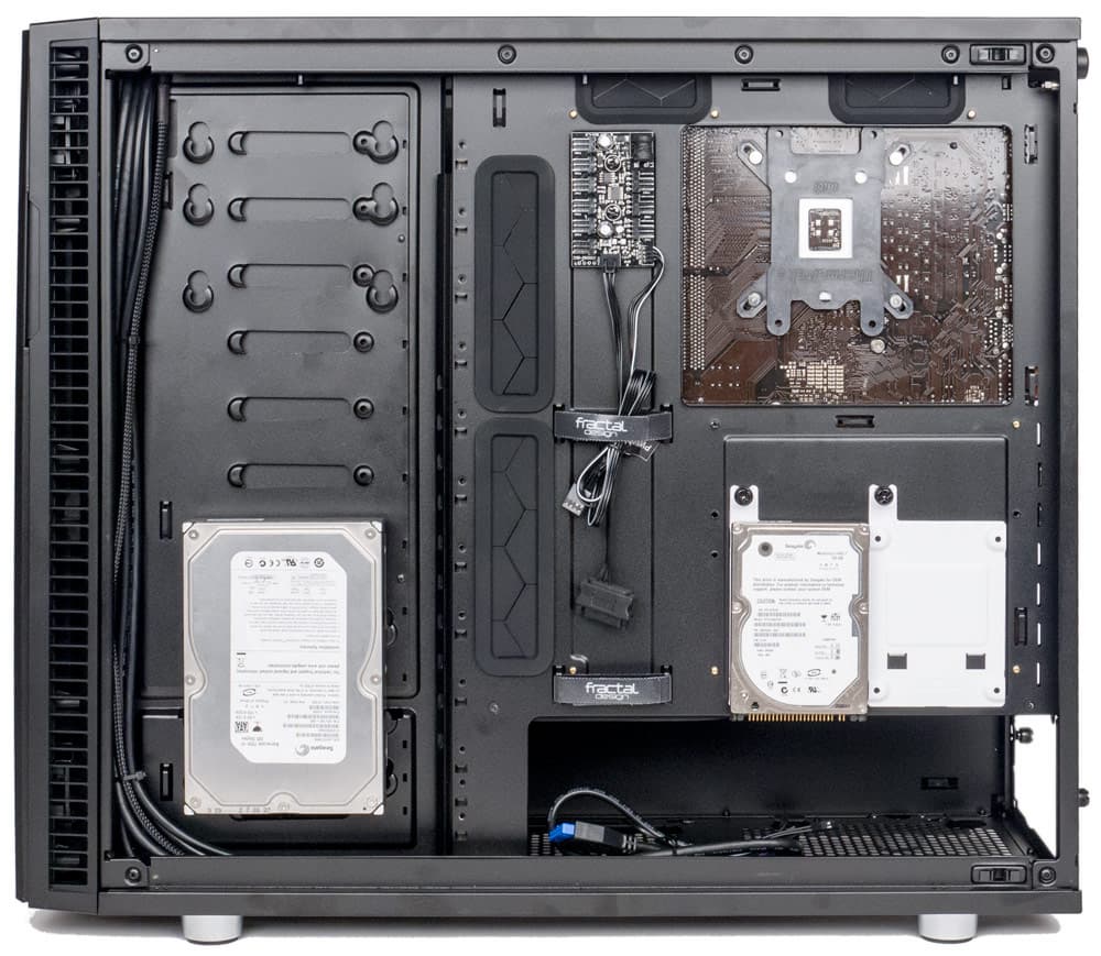 Но, конечно, стеклянную левую стенку вряд ли можно считать серьезным препятствием для шума, поэтому для действительно «малошумящего» компьютера следует выбирать модели Define R6 без букв TG в индексе.