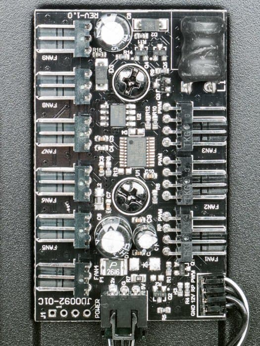 Корпус оснащен одноканальным контроллером вентиляторов, который может управлять шестью вентиляторами одновременно, а также имеет дополнительные четырехконтактные разъемы для подключения процессорного кулера и вентиляторов с ШИМ-управлением. Питание контроллера осуществляется от разъема SATA Power двумя номиналами питающего напряжения: 5 В и 12 В. При подаче только 12 В контроллер регулировать выходное напряжение на разъемах не будет, а вентиляторы будут вращаться на максимальных оборотах. У данного контроллера отсутствует орган управления, который доступен для пользователя, а изменение выходного напряжения происходит в зависимости от сигнала по каналу ШИМ-управления процессорного кулера (коэффициента заполнения ШИМ), который подается на вход контроллера через соответствующий разъем.