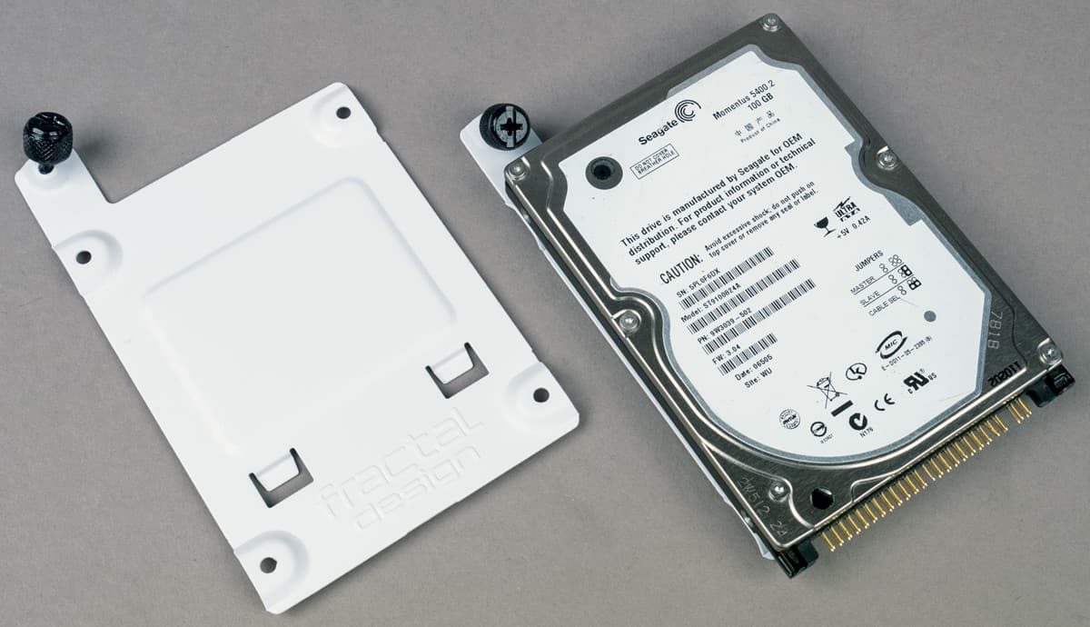 Салазки размерности 2,5″ попроще. Накопители к ним тоже крепятся винтами, а сами салазки для фиксации на тыльной стороне основания системной платы или на горизонтальной перегородке с одной стороны имеют пару выступов, а с другой невыпадающий винт с накатной головкой.