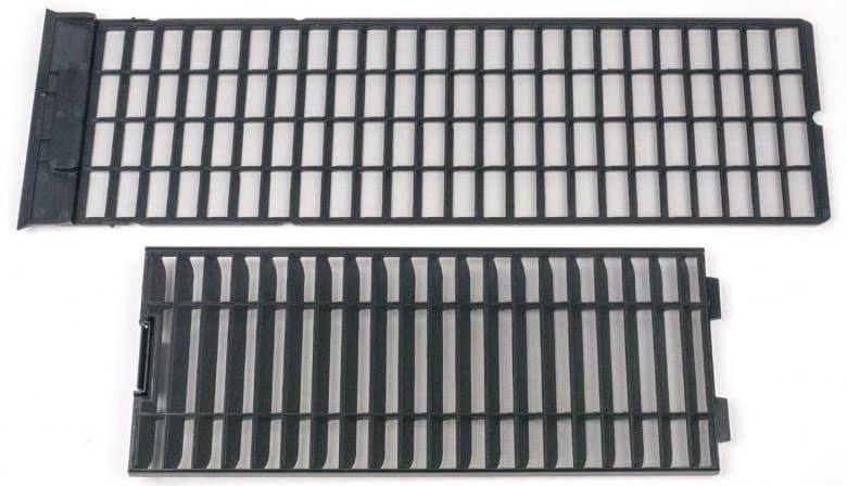 Вверху и спереди эта сетка прикреплена к пластиковой решетке, выполняющей еще и декоративную функцию, а внизу — к простенькой пластиковой рамке. Снятие любого из фильтров не составляет труда, обслужить их будет очень просто. Единственное затруднение может быть с нижним фильтром, расположенным под днищем корпуса: хотя он извлекается движением вперед, но длина его великовата — более полуметра.