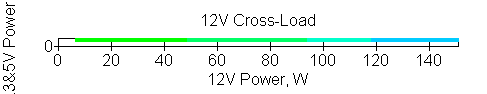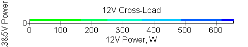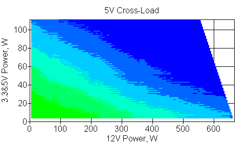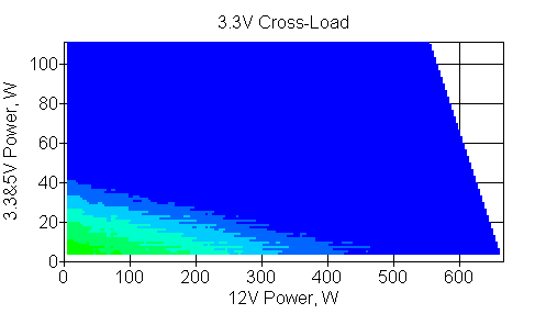 Следующим этапом инструментального тестирования является построение кросснагрузочной характеристики (КНХ) и представление ее на четвертьплоскости, ограниченной максимальной мощностью по шине 3,3&5 В с одной стороны (по оси ординат) и максимальной мощностью по шине 12 В с другой (по оси абсцисс). В каждой точке измеренное значение напряжения обозначается цветовым маркером в зависимости от отклонения от номинального значения.