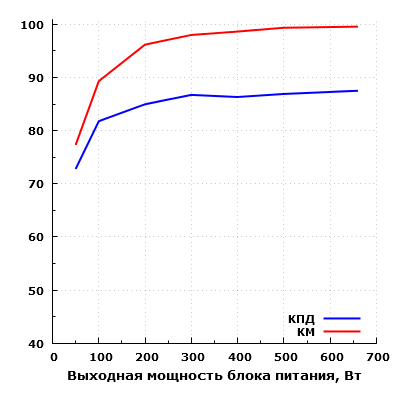 Эффективность БП находится на достойном уровне. Согласно нашим измерениям, КПД данного блока питания достигает значения свыше 86% в диапазоне мощности от 300 до 660 ватт. Максимальное зарегистрированное значение составило 87,5% на мощности 660 Вт. Одновременно с этим, КПД на мощности 50 Вт составил 76%.