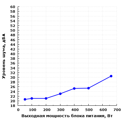 При работе с постоянно вращающимся вентилятором на мощности до 300 Вт включительно шум блока питания находится на очень низком уровне — менее 23 дБА с расстояния 0,35 метра. Работающий вентилятор в данных режимах не ухудшит общую акустическую эргономику компьютера даже ночью.