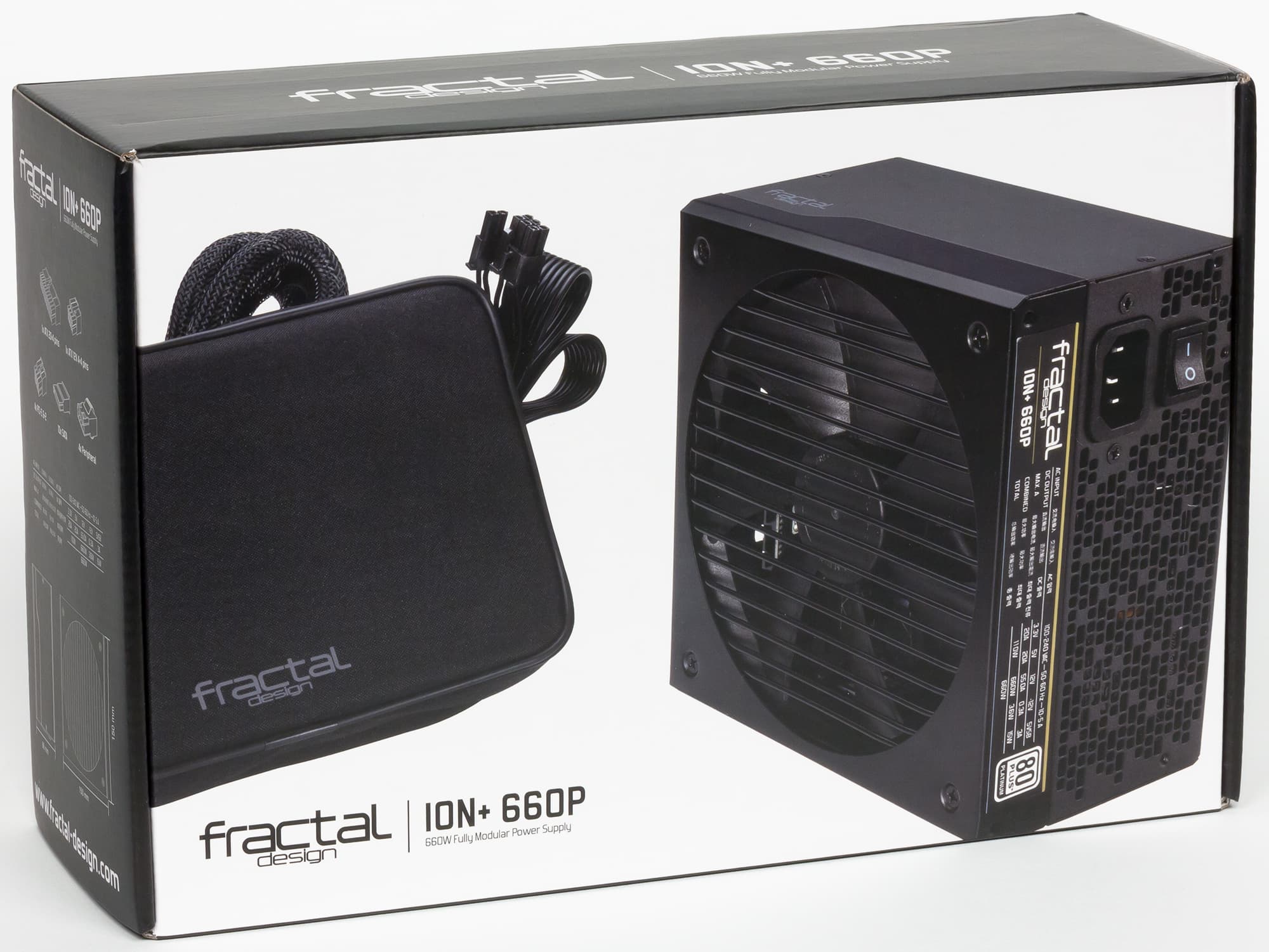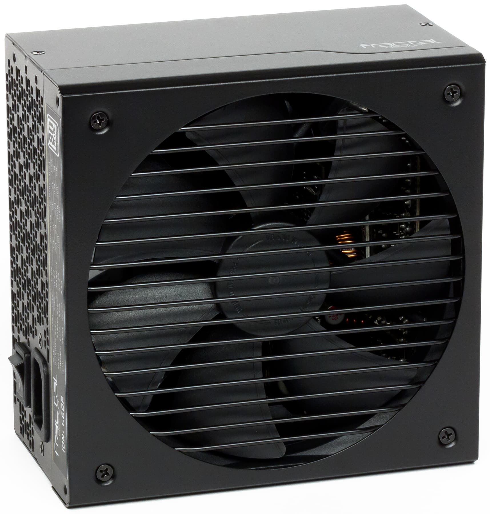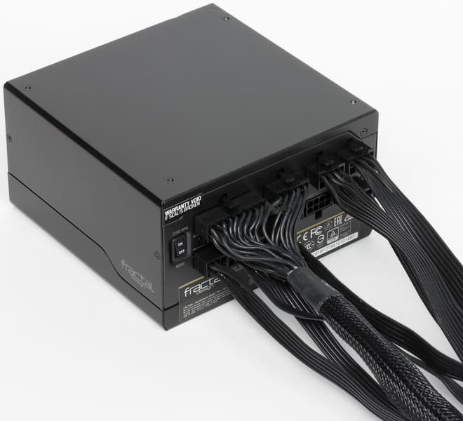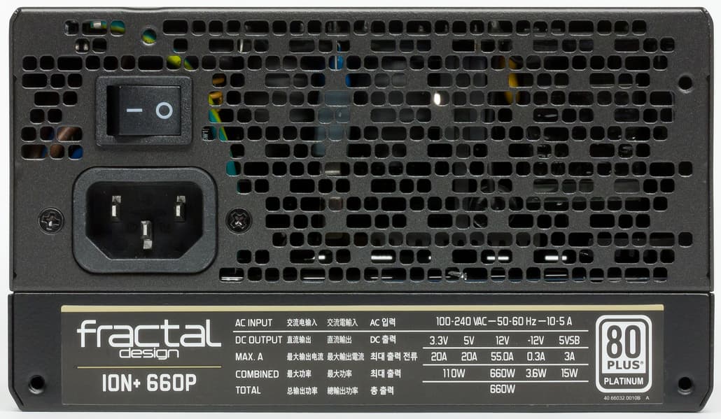 Недавно мы протестировали старшую модель Fractal Design Ion+ 860P новейшей серии Ion+ этого производителя, а теперь поговорим о блоке питания Fractal Design Ion+ 660P. Внешний вид блока питания вполне привычен: черный корпус с проволочной решеткой. Корпус покрыт эмалью, которая на ощупь напоминает пластмассу. Из оригинальных решений — наличие переключателя, который позволяет выбрать режим работы системы охлаждения: гибридный (с останавливающимся вентилятором) или обычный (с постоянно вращающимся вентилятором). Правда, размещен переключатель таким образом, что после установки блока питания в корпус он окажется внутри системного блока и добраться до него не всегда будет просто.