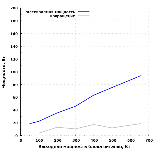 Экономичность модели находится на хорошем уровне: на максимальной мощности БП рассеивает около 94 Вт, а 60 Вт он рассеивает на мощности порядка 380 Вт. На мощности 50 Вт блок питания рассеивает около 19 Вт.