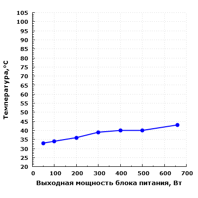 Температура выросла, но даже на максимальной мощности термонагруженность осталась относительно невысокой. Уровень шума вырос минимально. Можно констатировать, что данная модель блока питания очень хорошо приспособлена для работы при повышенной температуре окружающего воздуха.