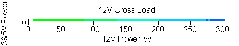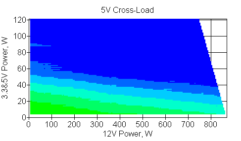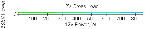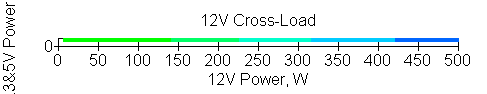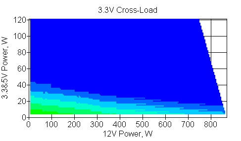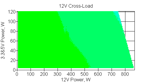 Следующим этапом инструментального тестирования является построение кросснагрузочной характеристики (КНХ) и представление ее на четвертьплоскости, ограниченной максимальной мощностью по шине 3,3&5 В с одной стороны (по оси ординат) и максимальной мощностью по шине 12 В с другой (по оси абсцисс). В каждой точке измеренное значение напряжения обозначается цветовым маркером в зависимости от отклонения от номинального значения.