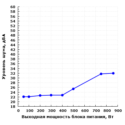При работе с постоянно вращающимся вентилятором на мощности до 400 Вт включительно шум блока питания находится на очень низком уровне — менее 23 дБА с расстояния 0,35 метра. Работающий вентилятор в данных режимах не ухудшит общую акустическую эргономику компьютера даже ночью.