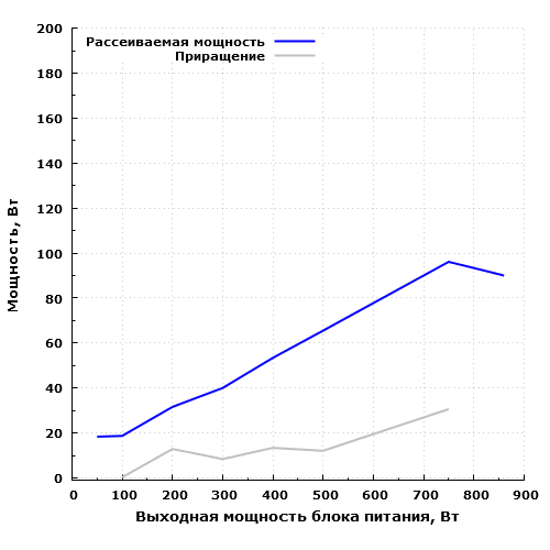 Экономичность модели находится на хорошем уровне: на максимальной мощности БП рассеивает около 90 Вт, а 60 Вт он рассеивает на мощности порядка 450 Вт. На мощности 50 Вт блок питания рассеивает около 18 Вт.