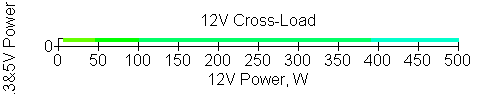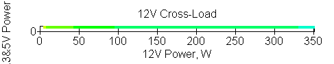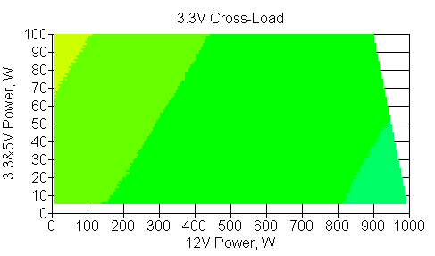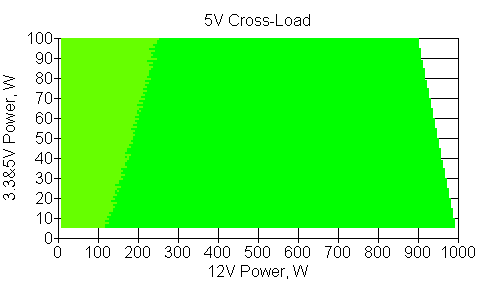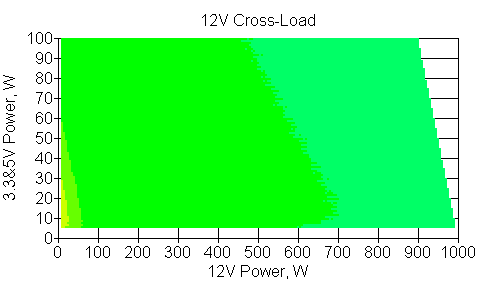 Следующим этапом инструментального тестирования является построение кросснагрузочной характеристики (КНХ) и представление ее на четвертьплоскости, ограниченной максимальной мощностью по шине 3,3&5 В с одной стороны (по оси ординат) и максимальной мощностью по шине 12 В с другой (по оси абсцисс). В каждой точке измеренное значение напряжения обозначается цветовым маркером в зависимости от отклонения от номинального значения.
