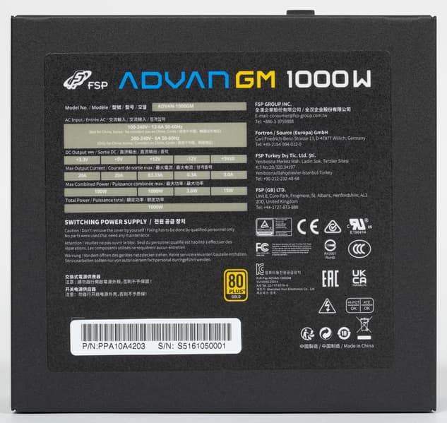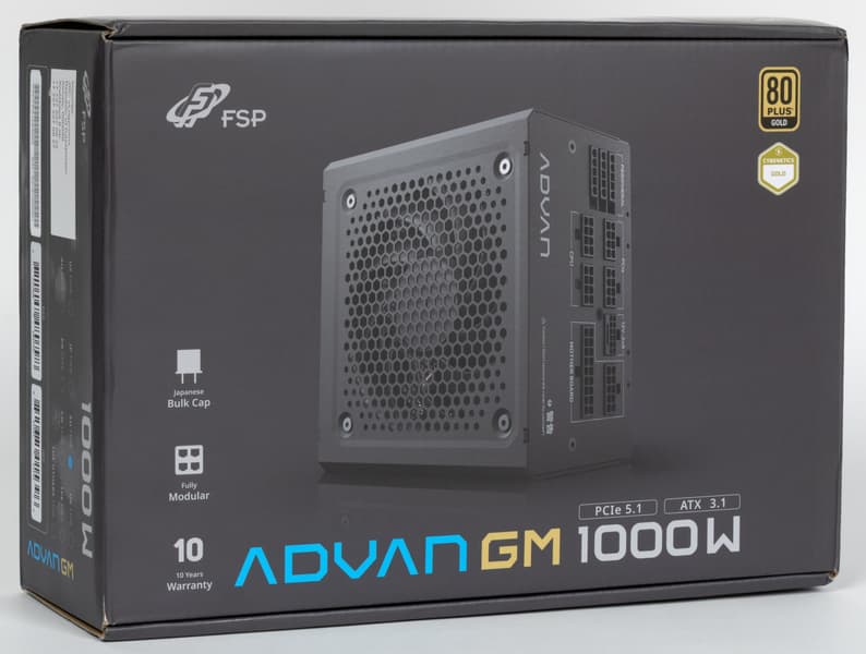 В этот раз мы познакомимся с блоком питания FSP Advan GM 1000W мощностью 1000 Вт, который имеет сертификат 80Plus Gold. Блок питания соответствует стандарту ATX 3.1 и позволяет питать очень мощные современные видеокарты через 16-контактный разъем PCIe 5.1 (12V-2×6). В данной серии существуют также модели мощностью 750 и 850 Вт.