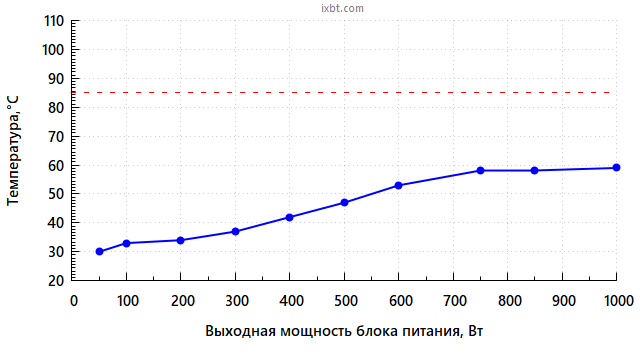 Также стоит учитывать, что в случае работы с остановленным вентилятором температура компонентов внутри БП сильно зависит от окружающей температуры воздуха, и если та установится на уровне 40-45 °C, это приведет к более раннему включению вентилятора.