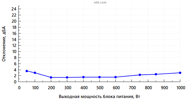 В диапазоне мощности до 600 Вт включительно шум данной модели соответствует среднетипичному уровню при расположении БП в ближнем поле. При более значительном удалении блока питания и размещении его под столом в корпусе с нижним расположением БП такой шум можно будет трактовать как находящийся на уровне ниже среднего. В дневное время суток в жилом помещении источник с подобным уровнем шума будет не слишком заметен, особенно с расстояния в метр и более, и тем более он будет малозаметен в офисном помещении, так как фоновый шум в офисах обычно выше, чем в жилых помещениях. В ночное время суток источник с таким уровнем шума будет хорошо заметен, спать рядом будет затруднительно. Подобный уровень шума можно считать комфортным при работе за компьютером.