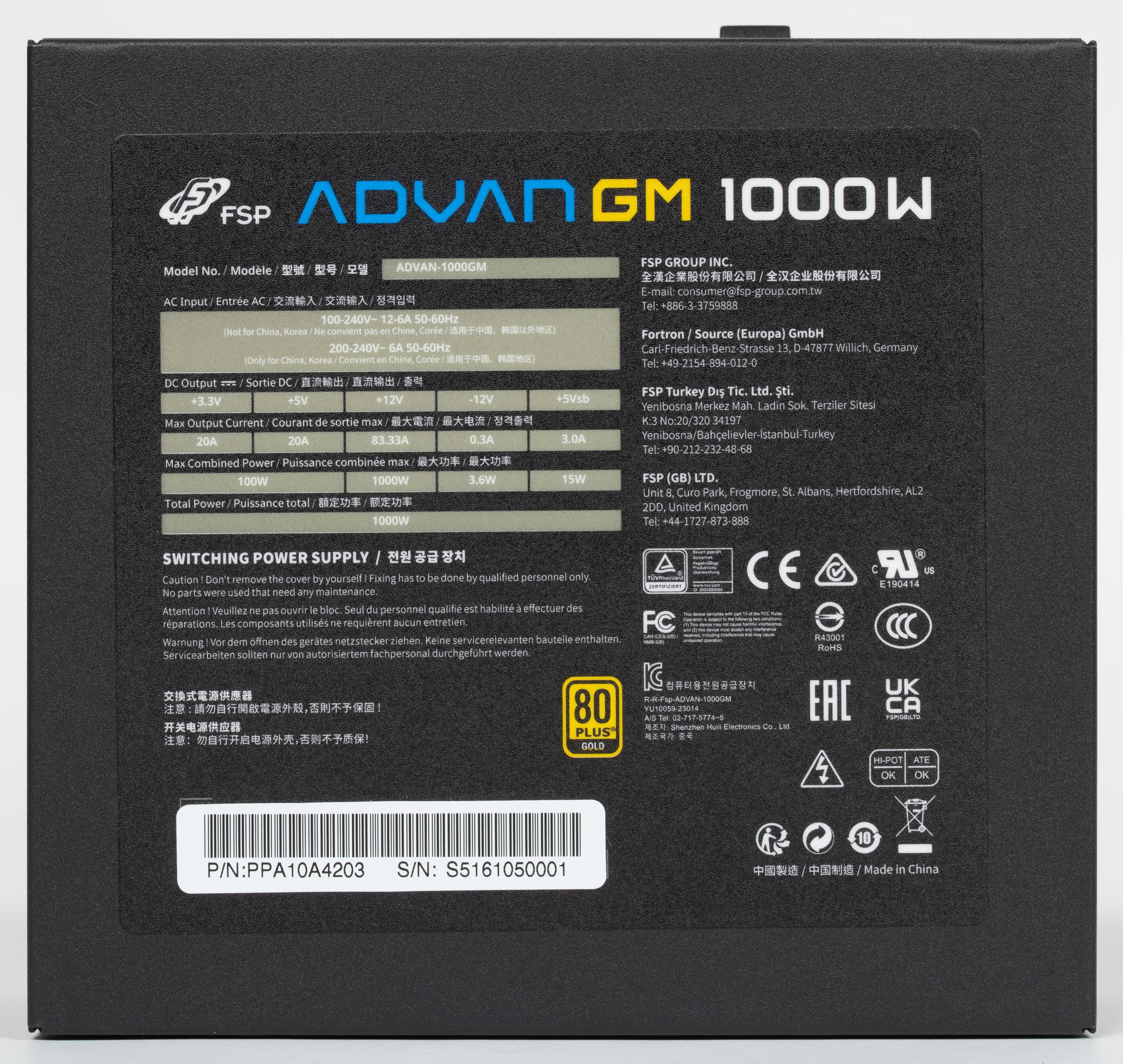Потребительские качества FSP Advan GM 1000W находятся на хорошем уровне. Нагрузочная способность канала +12VDC высокая, что позволяет использовать данный БП в мощных системах с двумя видеокартами или одной максимально мощной.