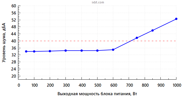 С точки зрения акустической эргономики, блок питания обеспечивает комфорт при выходной мощности в пределах 600 ватт, но по-настоящему тихим его назвать нельзя, причем даже в гибридном режиме.