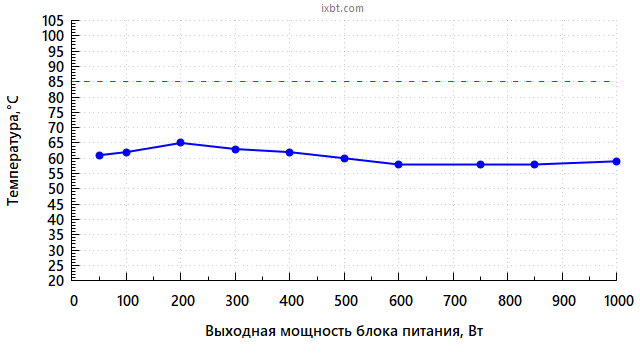 Включается вентилятор при температуре около 62 градусов, а выключается — в районе 59 градусов. При столь малой разнице между температурами выключения и включения вентилятора вполне ожидаемыми оказались частые циклы старт/стоп при мощности нагрузки от 100 до 600 Вт включительно. На мощности 750 Вт и выше подобные особенности работы вентилятора уже малозаметны.