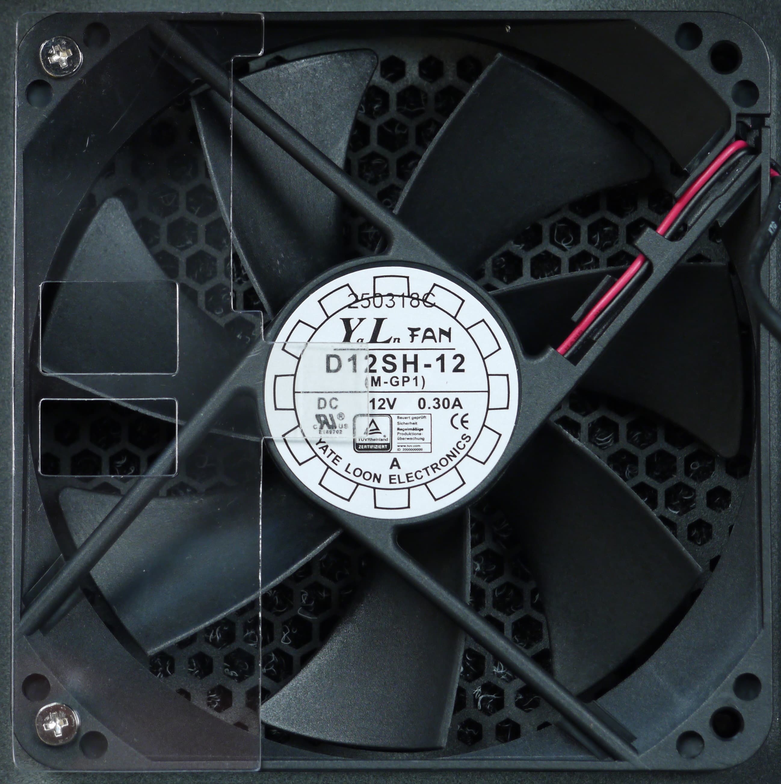 В блоке питания установлен вентилятор Yate Loon D12SH-12(M-GP1) типоразмера 120 мм (2200 об./мин), подключение двухпроводное, через разъем. Вентилятор основан на гидравлическом подшипнике, что подразумевает долгий срок его службы.