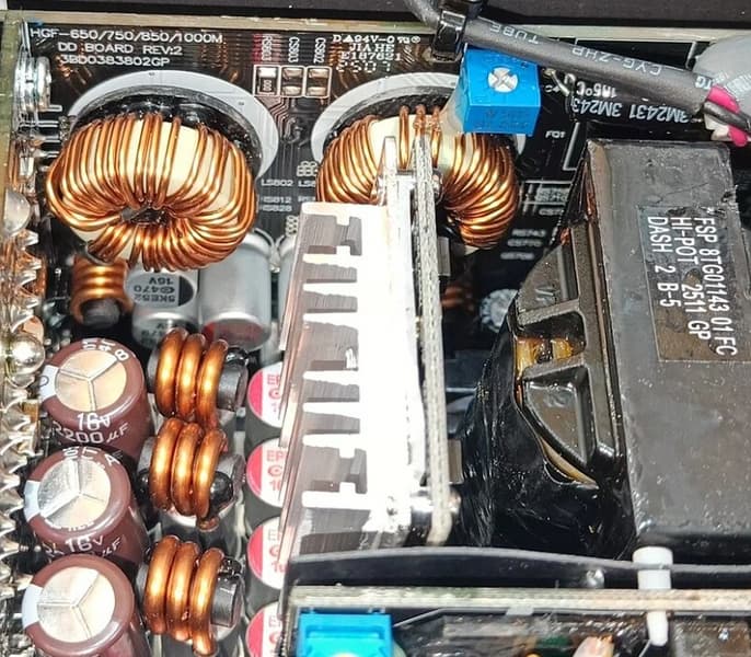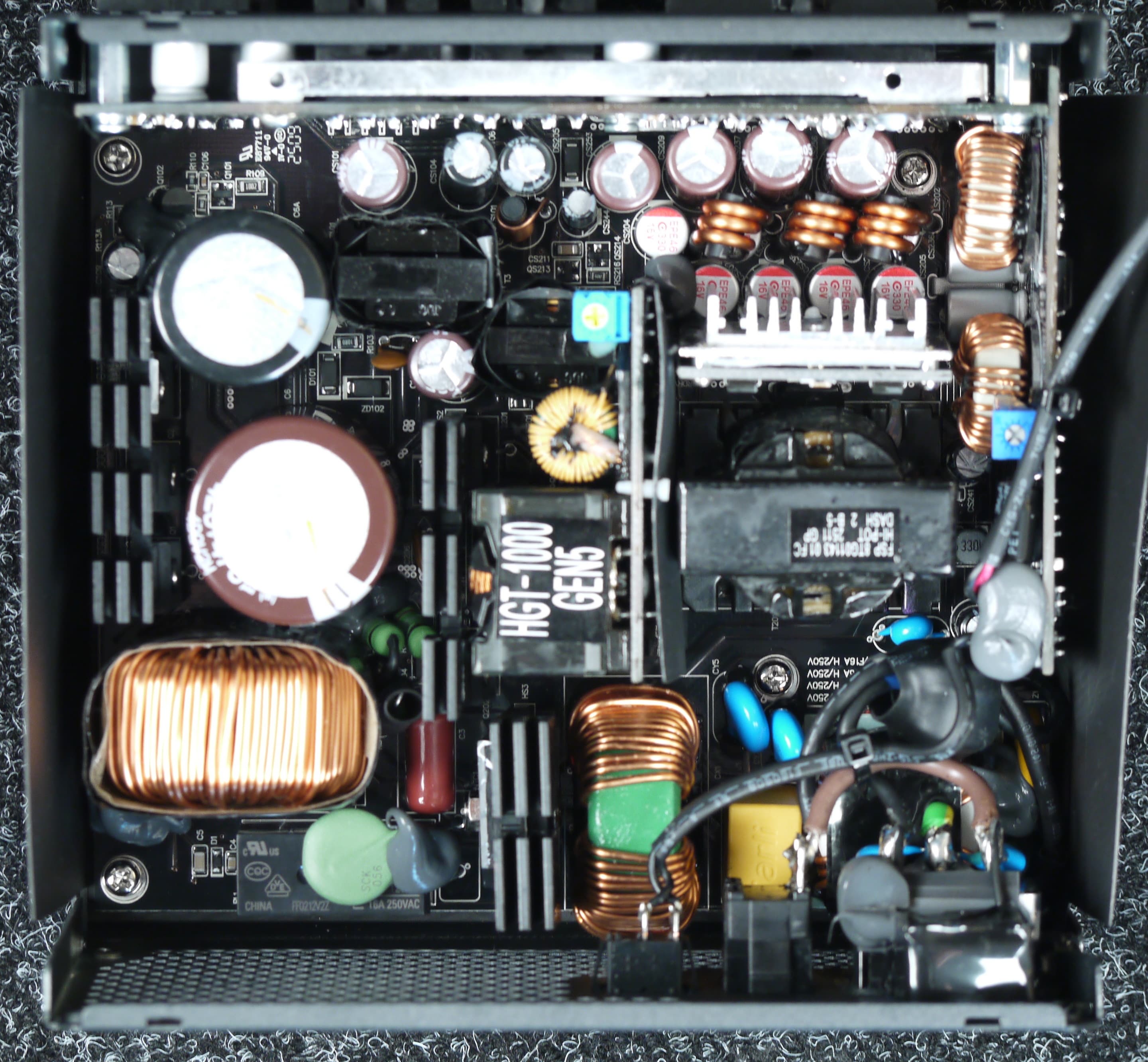 Высоковольтные силовые элементы установлены на нескольких радиаторах разных размеров, элементы синхронного выпрямителя установлены на дочерней печатной плате, которая установлена вертикально. Поверх полупроводниковых элементов выпрямителя установлен радиатор.