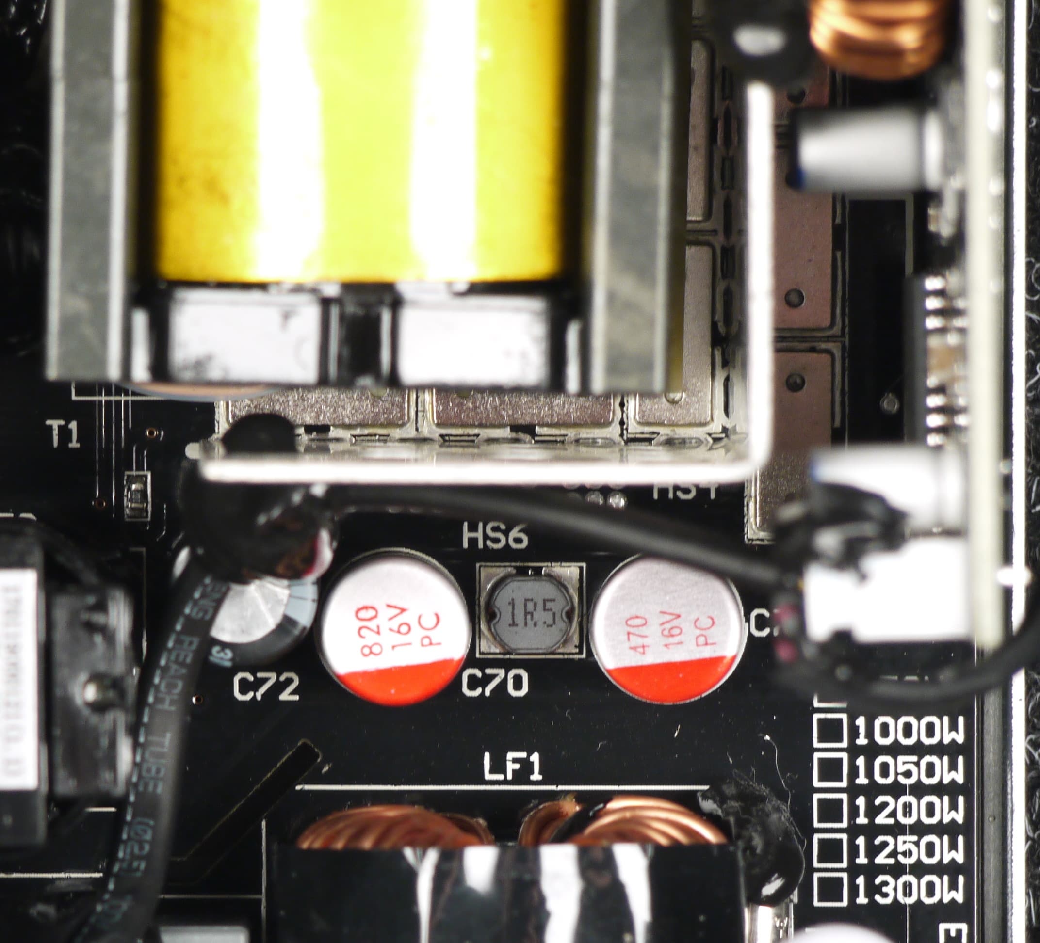 Полупроводниковые элементы высоковольтных цепей размещены на двух радиаторах, входной выпрямитель расположен на отдельном теплоотводе. Элементы синхронного выпрямителя установлены с оборотной стороны основной печатной платы, с лицевой стороны платы над ними имеется теплоотвод.