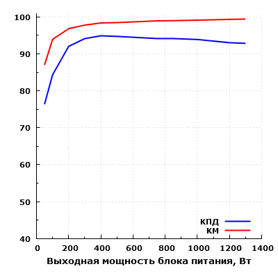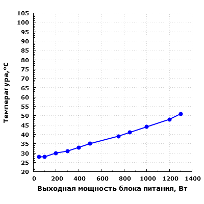 Всего таким образом мы измерили параметры блока питания в 11 точках. В результате максимальный КПД в нашем случае составил 94,9% при выходной мощности 400 Вт. Максимальная рассеиваемая мощность составила 100 Вт при выходной мощности 1300 Вт, что совсем немного для блока питания подобной мощности.