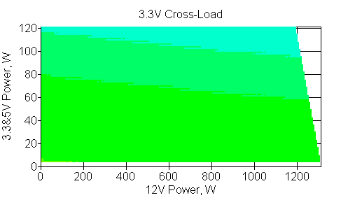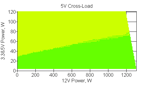 Следующим этапом инструментального тестирования является построение кросснагрузочной характеристики (КНХ) и представление ее на четвертьплоскости, ограниченной максимальной мощностью по шине 3,3&5 В с одной стороны (по оси ординат) и максимальной мощностью по шине 12 В с другой (по оси абсцисс). В каждой точке измеренное значение напряжения обозначается цветовым маркером в зависимости от отклонения от номинального значения.