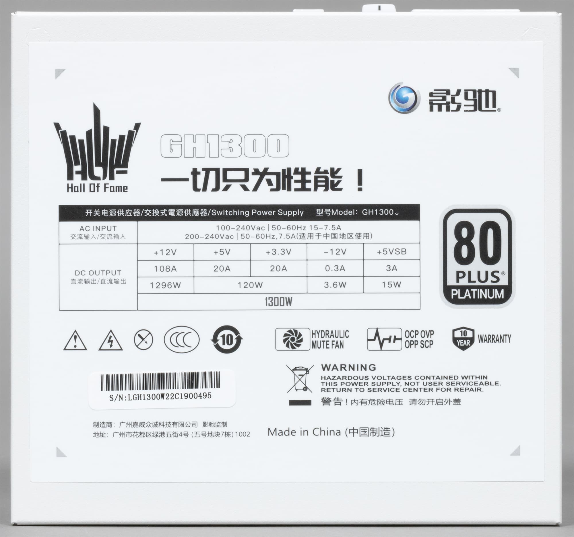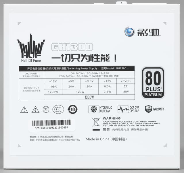 Блок питания Galax Hall of Fame GH1300 попал к нам редакцию напрямую из Китая, где был приобретен. Данная модель, согласно официальным данным, имеет сертификат 80+ Platinum и укомплектована исключительно японскими конденсаторами. Система охлаждения может работать в двух режимах: в гибридном, когда вентилятор при некоторых условиях не вращается, и в обычном — с постоянно вращающимся вентилятором. Переключаются режимы двухпозиционной кнопкой на внешней панели корпуса БП (отжатое положение соответствует гибридному режиму).