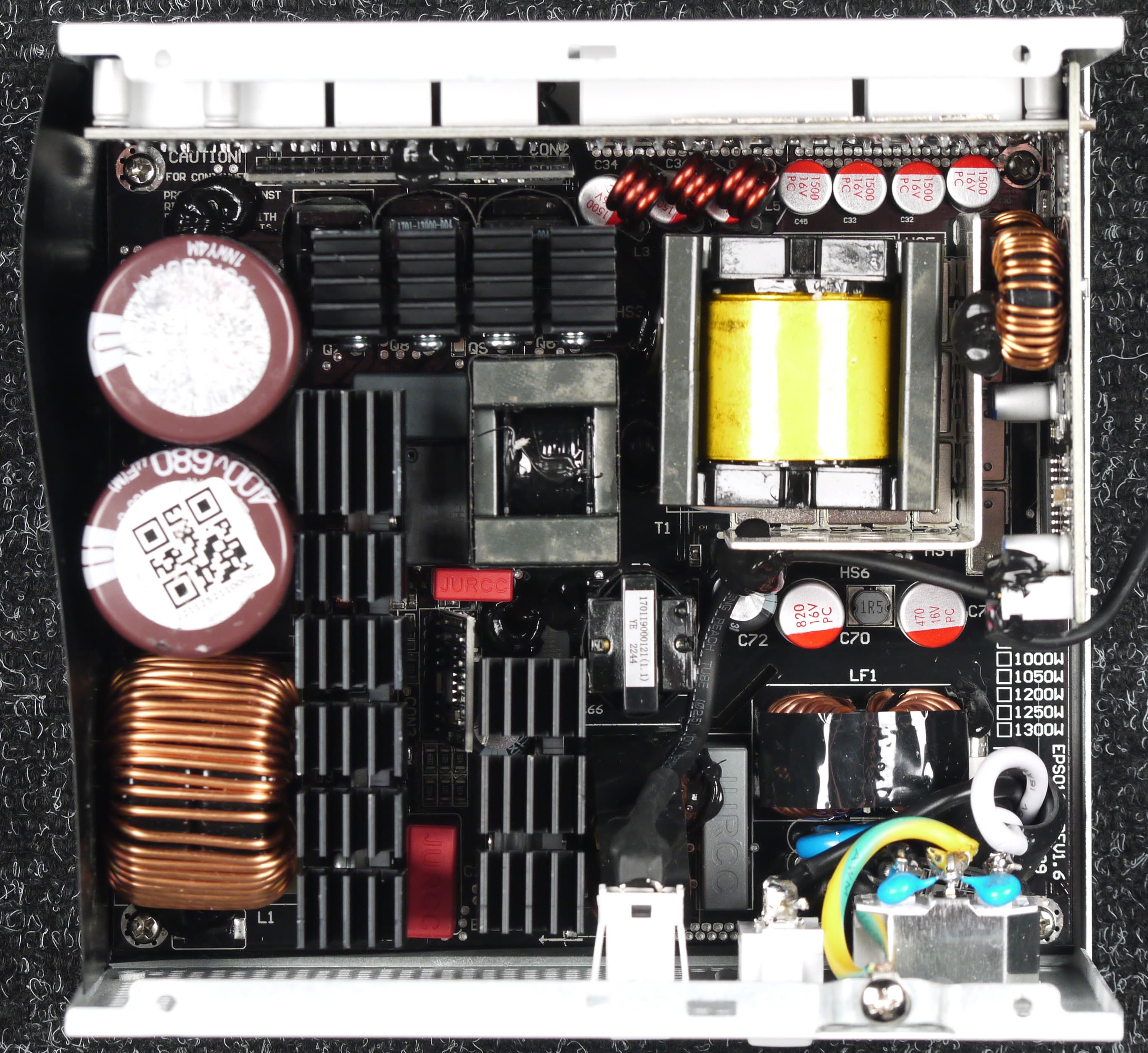 Конструкция блока питания вполне соответствует современным тенденциям: активный корректор коэффициента мощности, синхронный выпрямитель для канала +12VDC, независимые импульсные преобразователи постоянного тока для линий +3.3VDC и +5VDC.