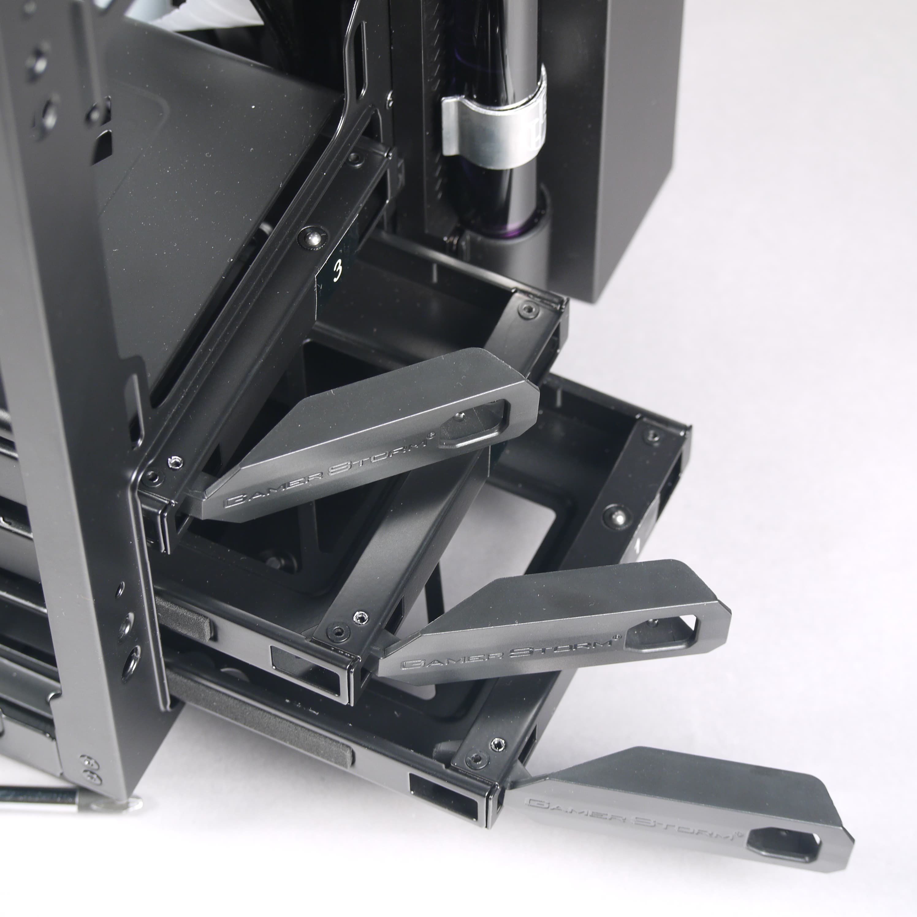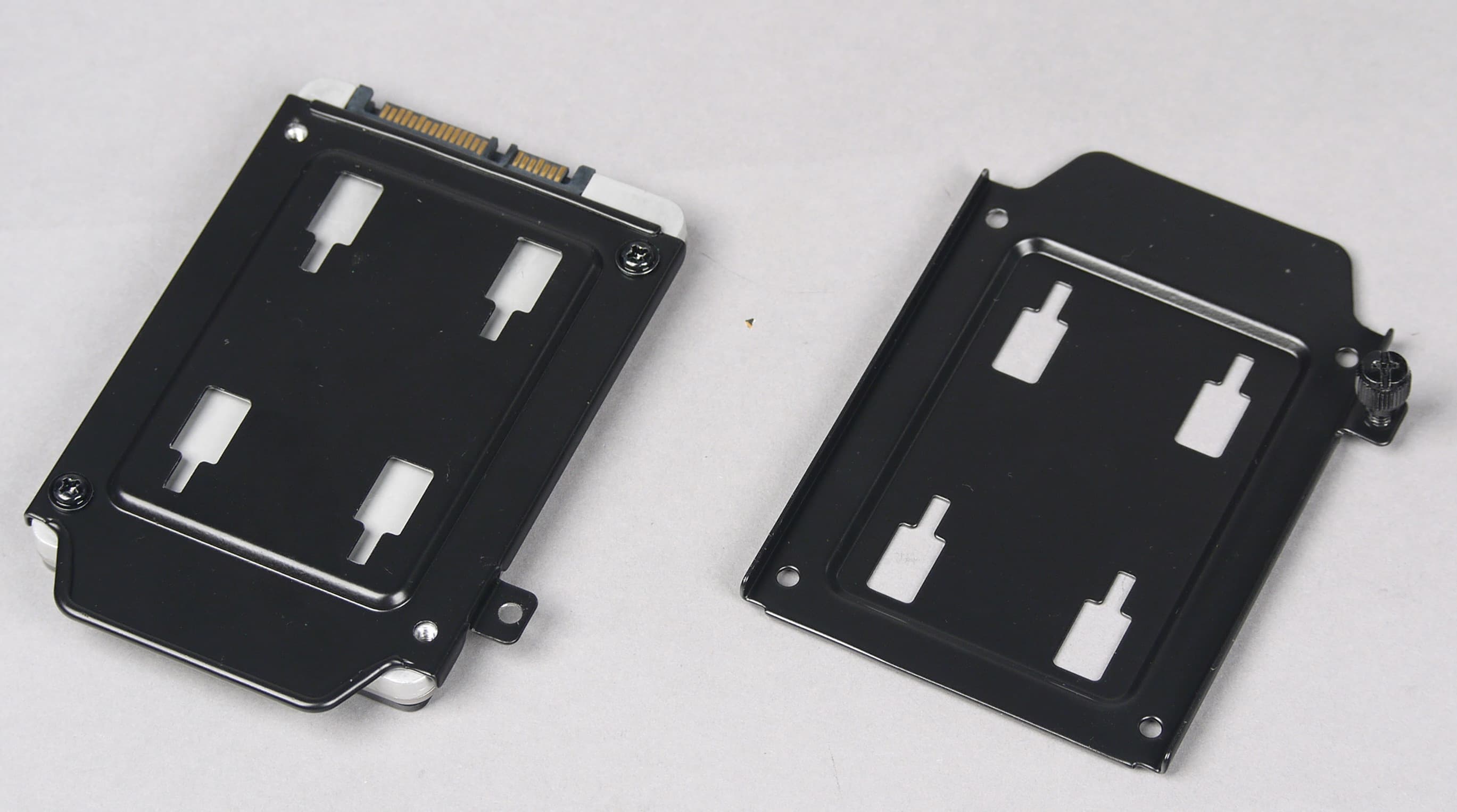 Для накопителей формата 2,5″ предусмотрены три быстросъемных контейнера, которые установлены на кожухе блока питания (1 штука) и на обратной стороне основания для системной платы (2 штуки). Крепление контейнеров осуществляется за счет бокового сдвига монтажных отверстий, которые цепляются за грибообразный элемент. Контейнеры дополнительно фиксируются винтами с накатной головкой.