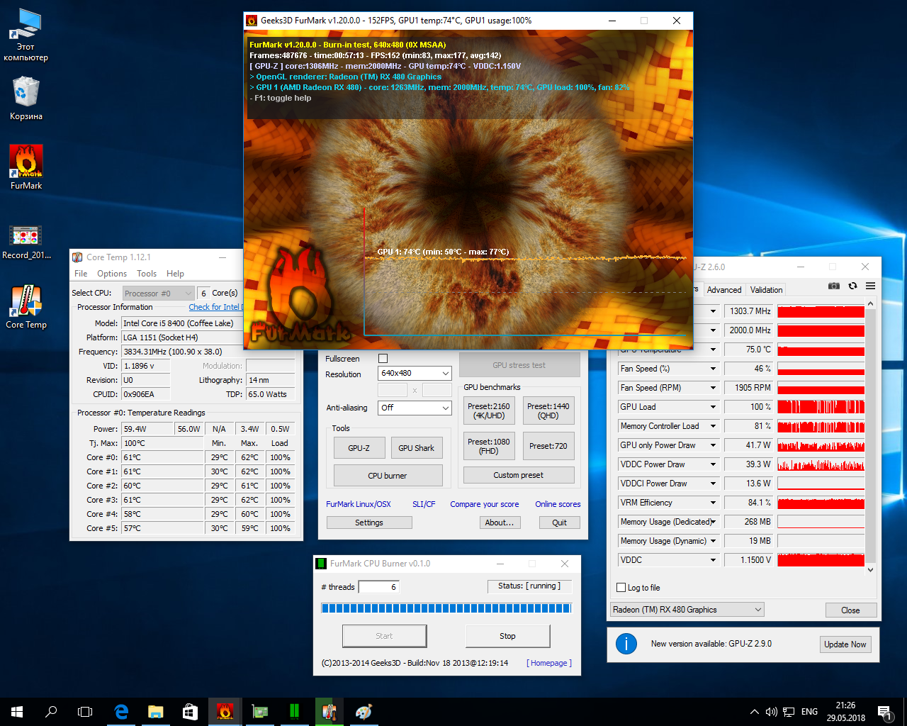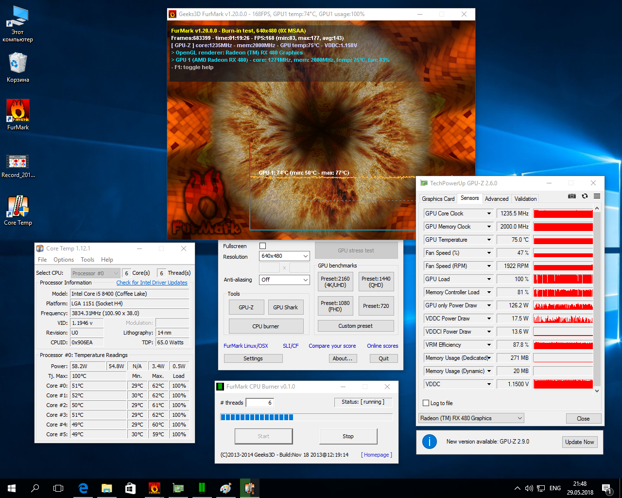Испытание было проведено как в закрытом корпусе, так и в корпусе со снятой передней панелью для улучшения притока воздуха снаружи. В результате температура видеокарты при снятой передней панели не изменилась, а вот температура процессора снизилась почти на 10 градусов.