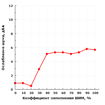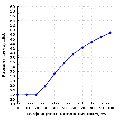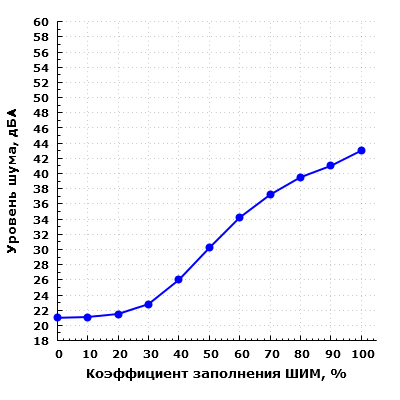 При большем удалении корпуса от пользователя и размещении его, к примеру, на полу под столом шум можно будет охарактеризовать как низкий при коэффициенте заполнения ШИМ до 30%, а при КЗ от 80% — как высокий для жилого помещения в дневное время суток.