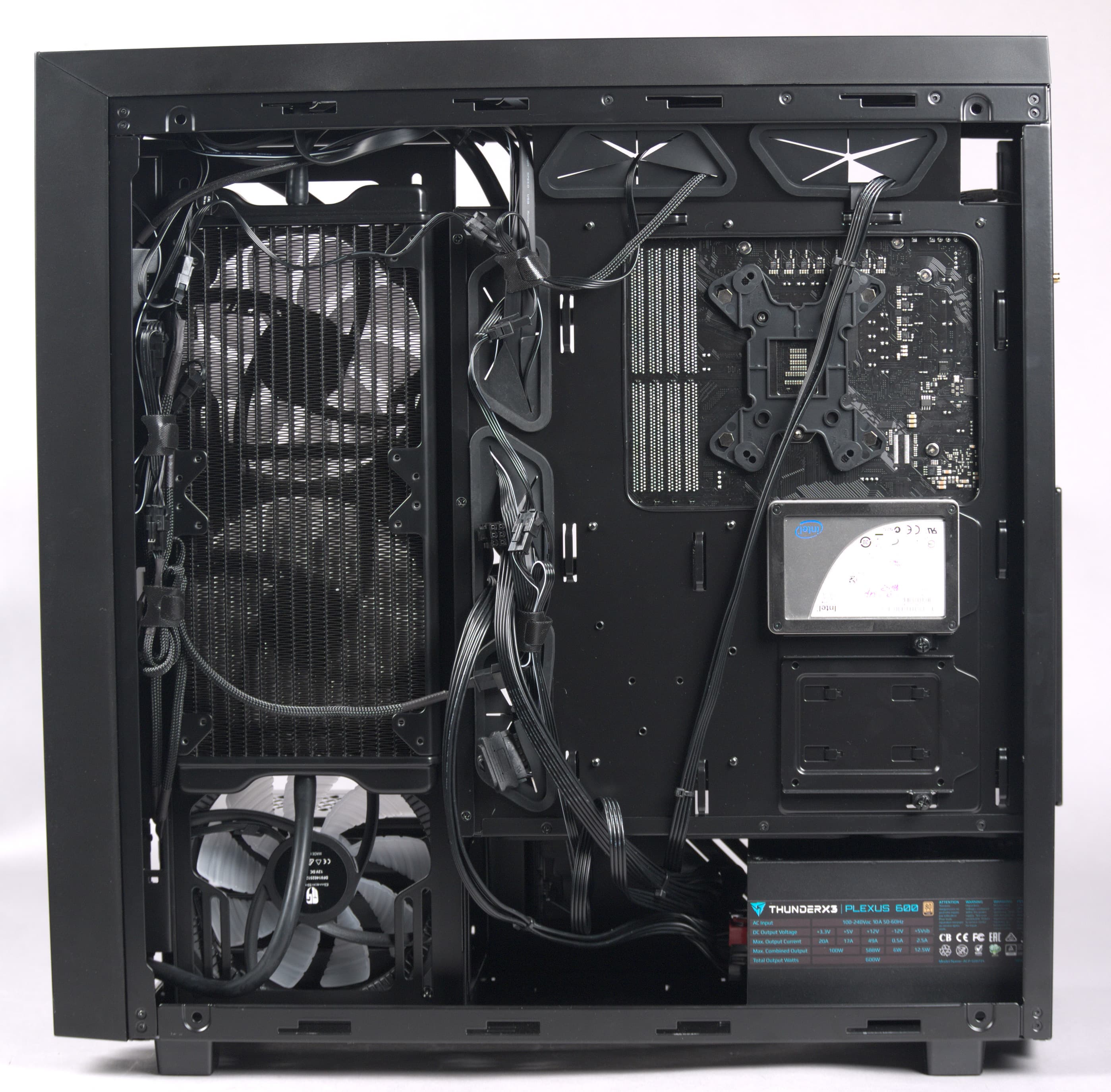 В корпус можно установить процессорный кулер высотой до 188 мм: расстояние от основания для системной платы до противоположной стенки составляет около 200 мм. Глубина отсека для прокладки проводов составляет около 25 мм у задней стенки.