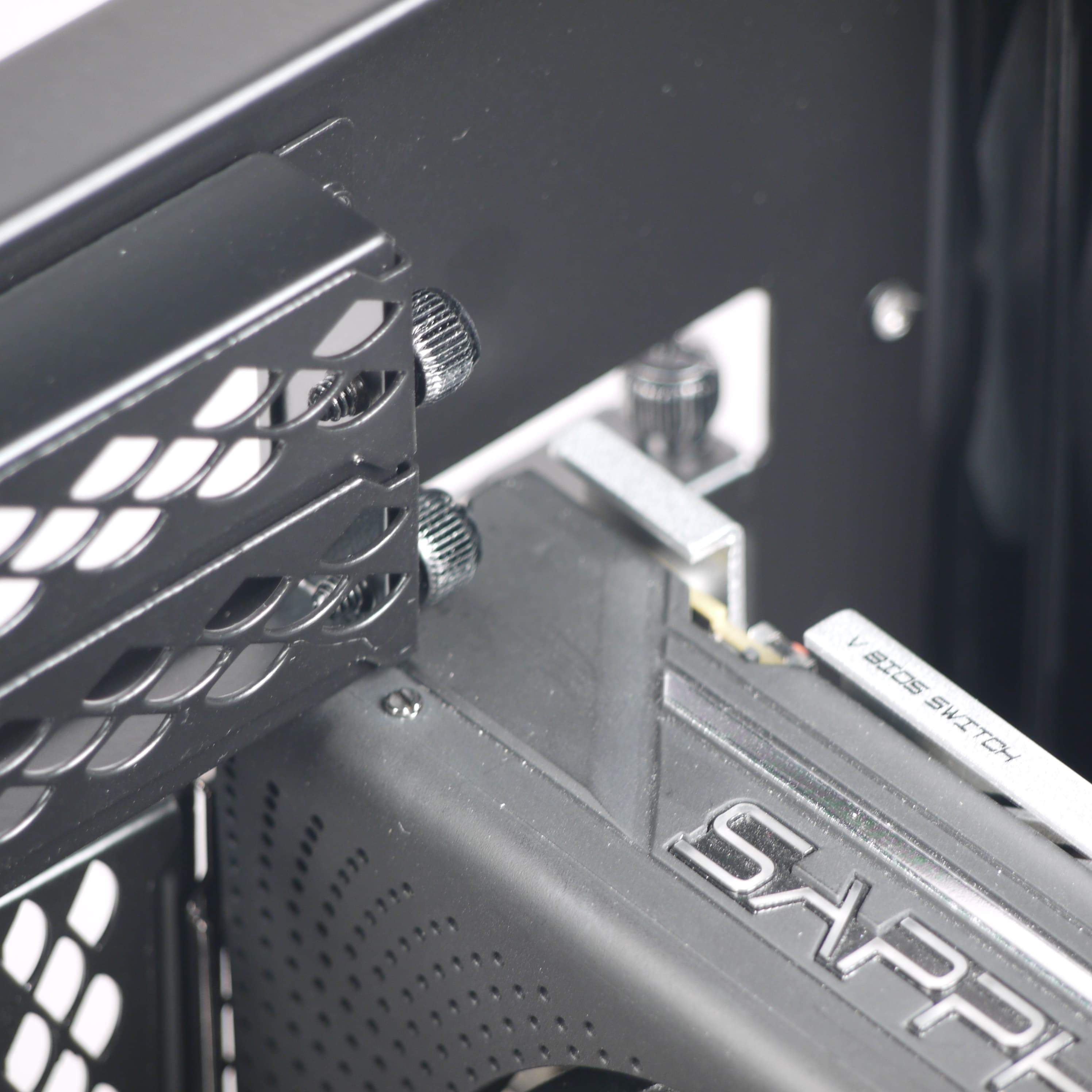 Крепление плат расширения в этом корпусе не самое удобное. Для установки двухслотовой видеокарты потребуется открутить не два и даже не три, а семь винтов, из которых три с накатной головкой: два держат съемные заглушки и еще один фиксирует дополнительную прижимную планку для этих же заглушек, а четыре — обычные винты, фиксирующие посадочное место для вертикально устанавливаемой видеокарты. Это посадочное место расположено поперек над стандартными отверстиями внутри корпуса, что заметно осложняет установку плат расширения.
