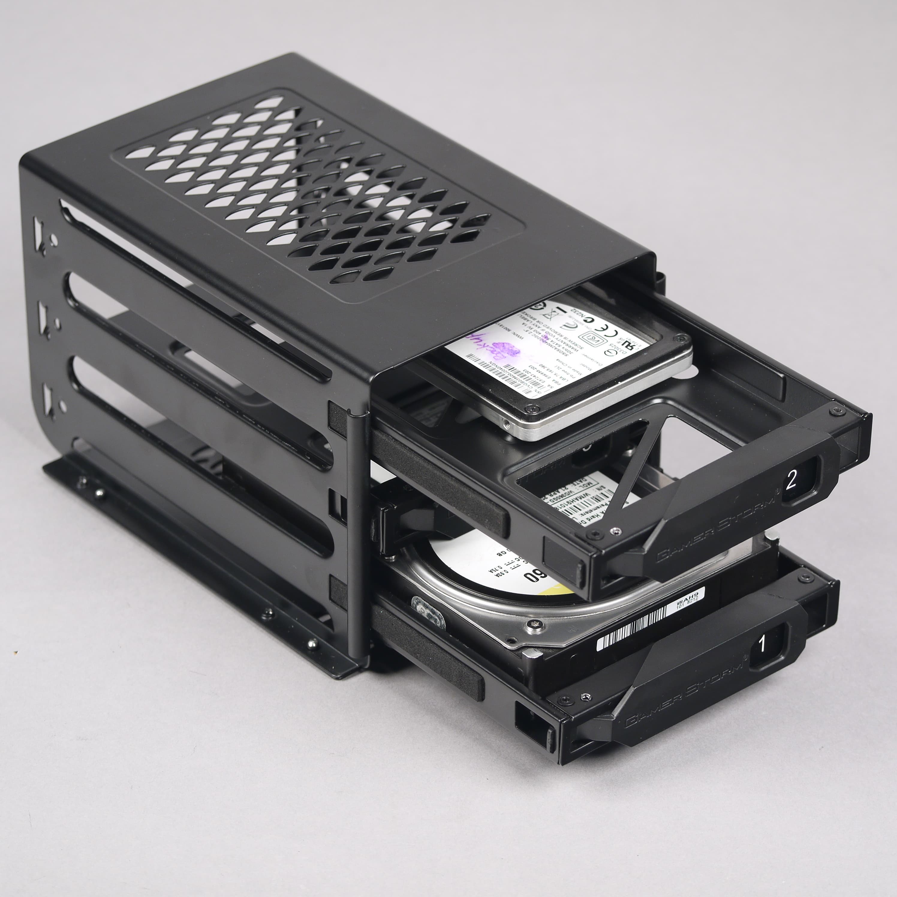Корзина имеет три универсальных посадочных места для накопителей формата 2,5″ или 3,5″, которые выполнены в виде съемных стальных контейнеров. Внутри них есть уплотнители из пластика, а снаружи — амортизирующие элементы из пенополиэтилена. Винты вкручиваются сквозь дно контейнера через втулки из резиноподобного материала. Фиксируются контейнеры при помощи пластиковых защелок, также есть опциональная возможность зафиксировать диск формата 3,5″ в корзине при помощи винта сквозь контейнер.