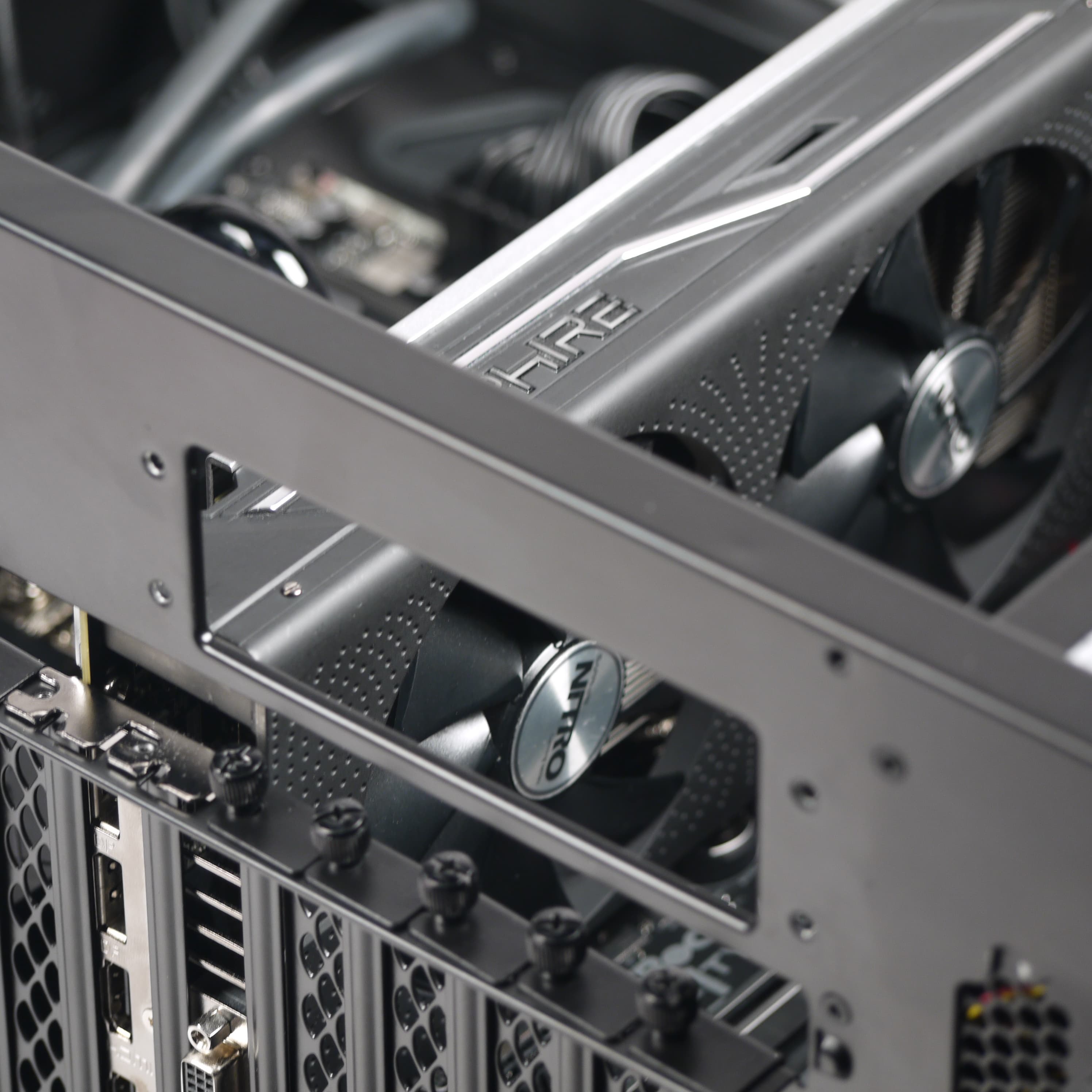 Длина плат расширения, устанавливаемых в этом корпусе, не такая большая, как можно подумать при взгляде снаружи. Поддерживаются платы длиной около 305 мм, если измерять от задней панели корпуса. В случае вертикальной установки длина платы может быть гораздо больше — около 400 мм, однако райзер в комплект поставки не входит, поэтому желающим установить видеокарту именно таким образом придется покупать его самостоятельно за немалые деньги.