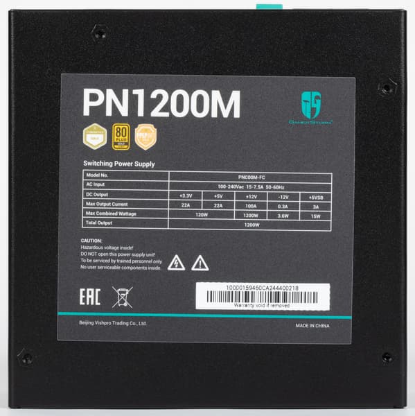 Все необходимые параметры указаны на корпусе блока питания в полном объеме, для мощности шины +12VDC заявлено значение 1200 Вт. Соотношение мощности по шине +12VDC и полной мощности составляет 100%, что, разумеется, является отличным показателем.