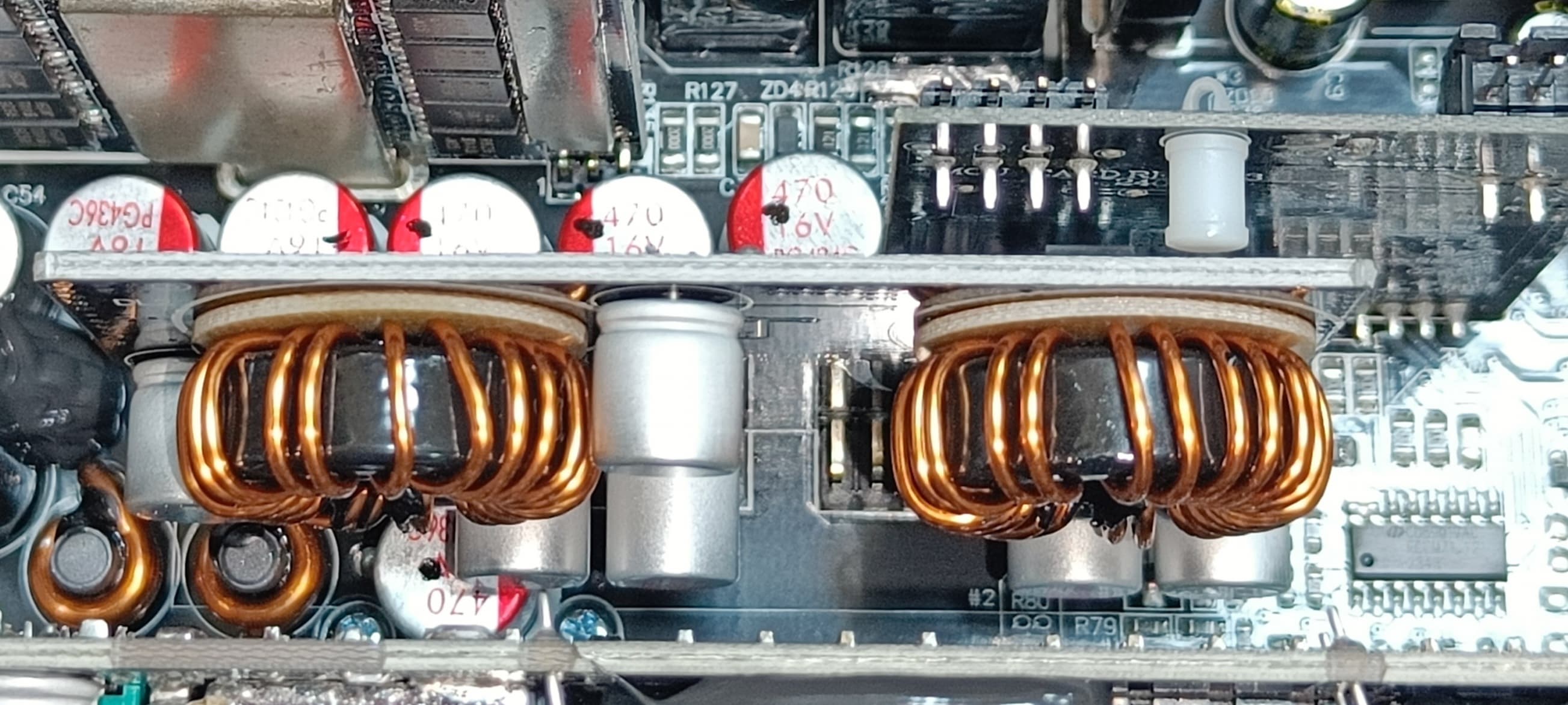 Полупроводниковые элементы высоковольтных цепей размещены на двух радиаторах, входной выпрямитель расположен на отдельном теплоотводе. Элементы синхронного выпрямителя размещены на дочерней плате, там же есть теплорассеивающие элементы.