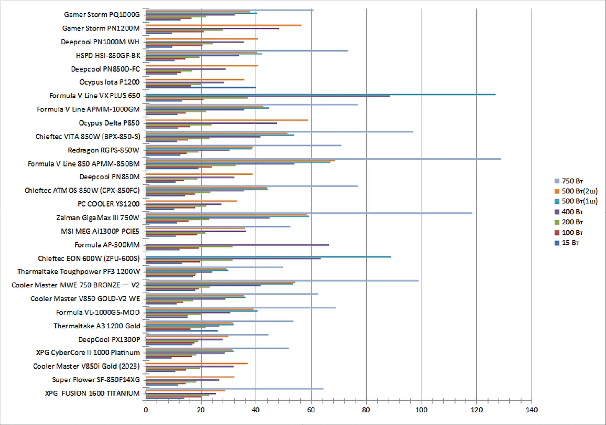 | Thermaltake GF1 1000 | 15,2 | 18,1 | 21,5 | 31,5 | 38,0 | 37,3 | 65,0 |