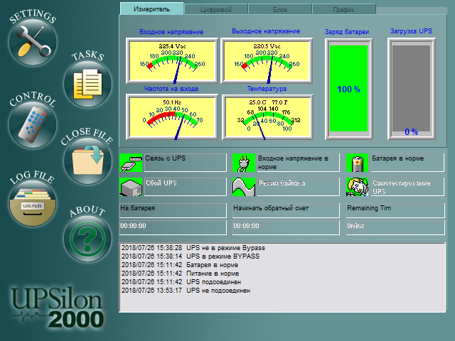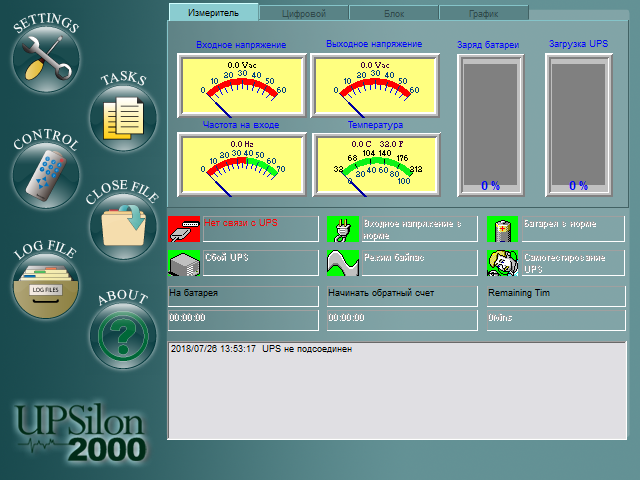 После этого в окне отображается состояние источника, которое может отображаться в четырех разных видах: аналоговые шкалы, цифровые значения, блок-схема и график.
