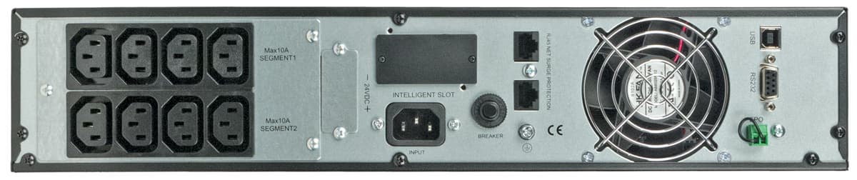 На задней панели различных органов гораздо больше: коммуникационные порты USB и RS232, порт аварийного отключения EPO, входной и выходной разъемы RJ45 для защиты слаботочных линий, а также восемь розеток IEC320 C13 для подключения нагрузок. Эти розетки разделены на две группы по четыре, обе подключены к инвертору, но имеют разный приоритет (об этом ниже).