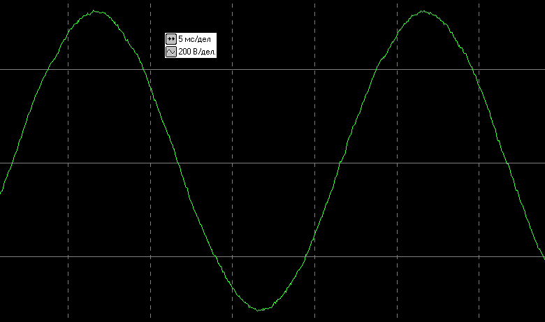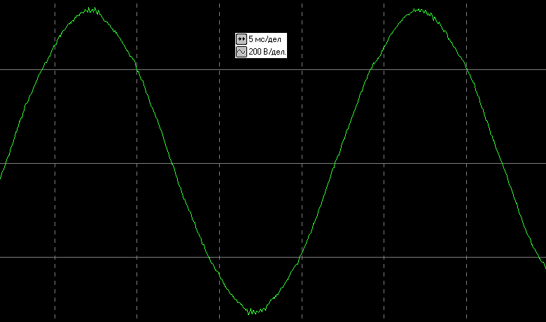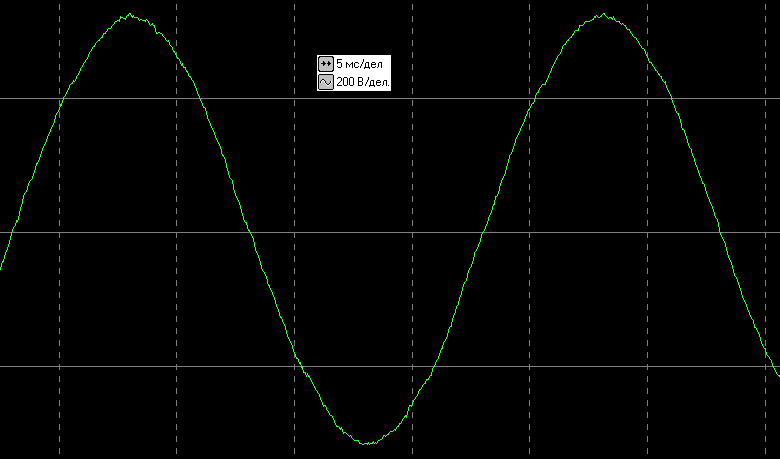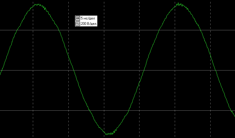 Форма выходного сигнала при работе от батарей практически не зависит ни от величины нагрузки, ни от ее типа. При заданном номинале 220 В отклонение не превышало 0,6 В, а суммарный коэффициент гармонических составляющих — 0,9%.