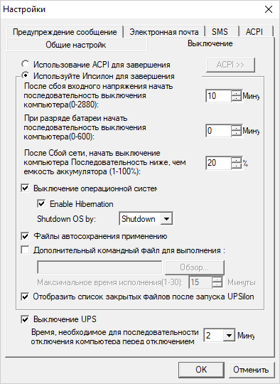 Управление можно передать интерфейсу ACPI компьютера, а можно сделать установки в окне программы UPSilon.