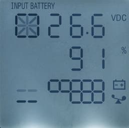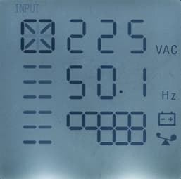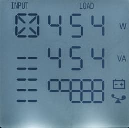 Панель управления состоит из ЖК-экрана, трех управляющих кнопок и четырех светодиодных индикаторов, отображающих текущий режим — работа от батареи, от внешней сети в обычном режиме (с инвертором) или в режиме байпаса, а также наличие какой-либо ошибки. Цифровой код ошибки отображается на экране, расшифровка некоторых кодов есть в инструкции.