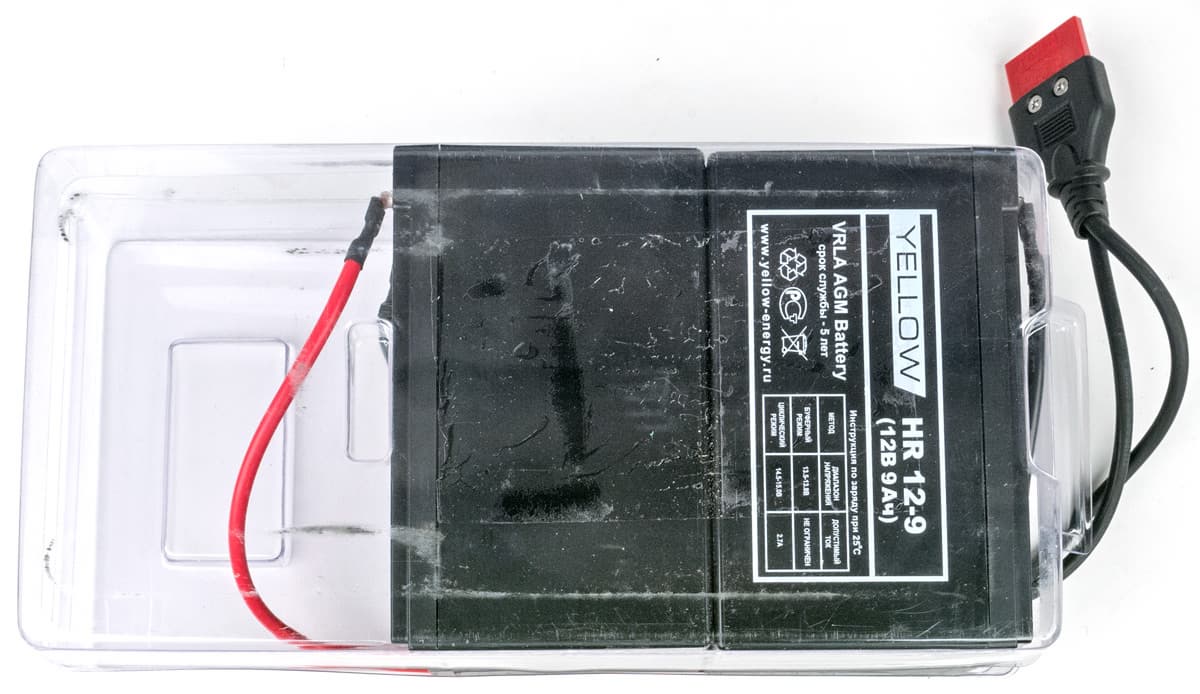 В нашем экземпляре источника были установлены две свинцово-кислотные АКБ HR 12-9 производства Yellow Energy, подключенные последовательно. Они входят в серию HighRate, которая производится по технологии AGM (электролит в них абсорбирован в стекловолоконном сепараторе), оснащены системой рекомбинации газов и могут использоваться в режиме интенсивного разряда. Заявленный срок службы 5 лет.