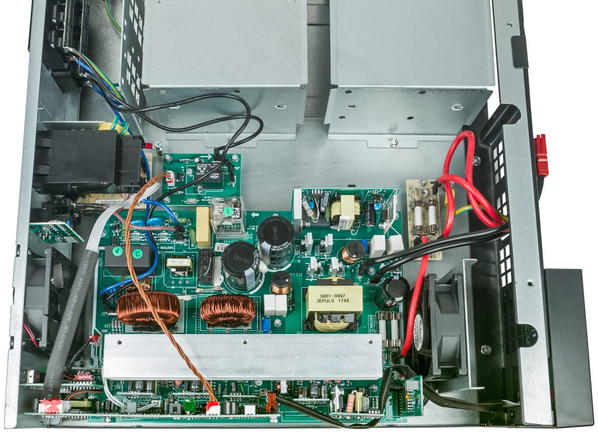 По понятным причинам большого и тяжелого низкочастотного трансформатора в данном ИБП нет, поэтому вес в значительной степени определяется батареями.