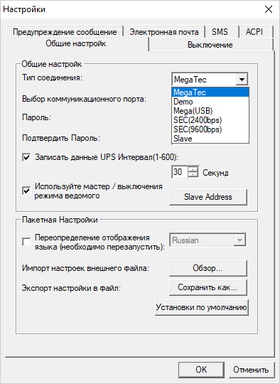 Если теперь подключить ИБП к компьютеру USB-кабелем, то программа его увидит только после смены в меню Settings установки для типа соединения: по умолчанию это MegaTec, нужно выбрать Mega(USB).