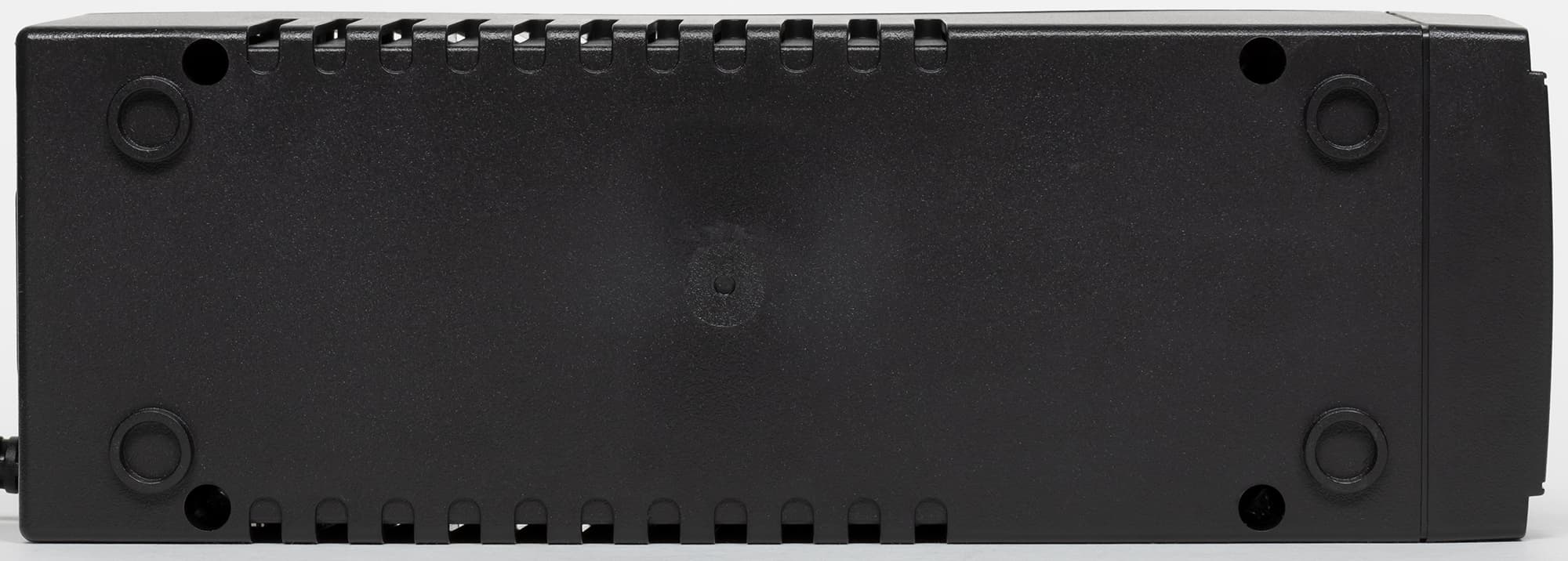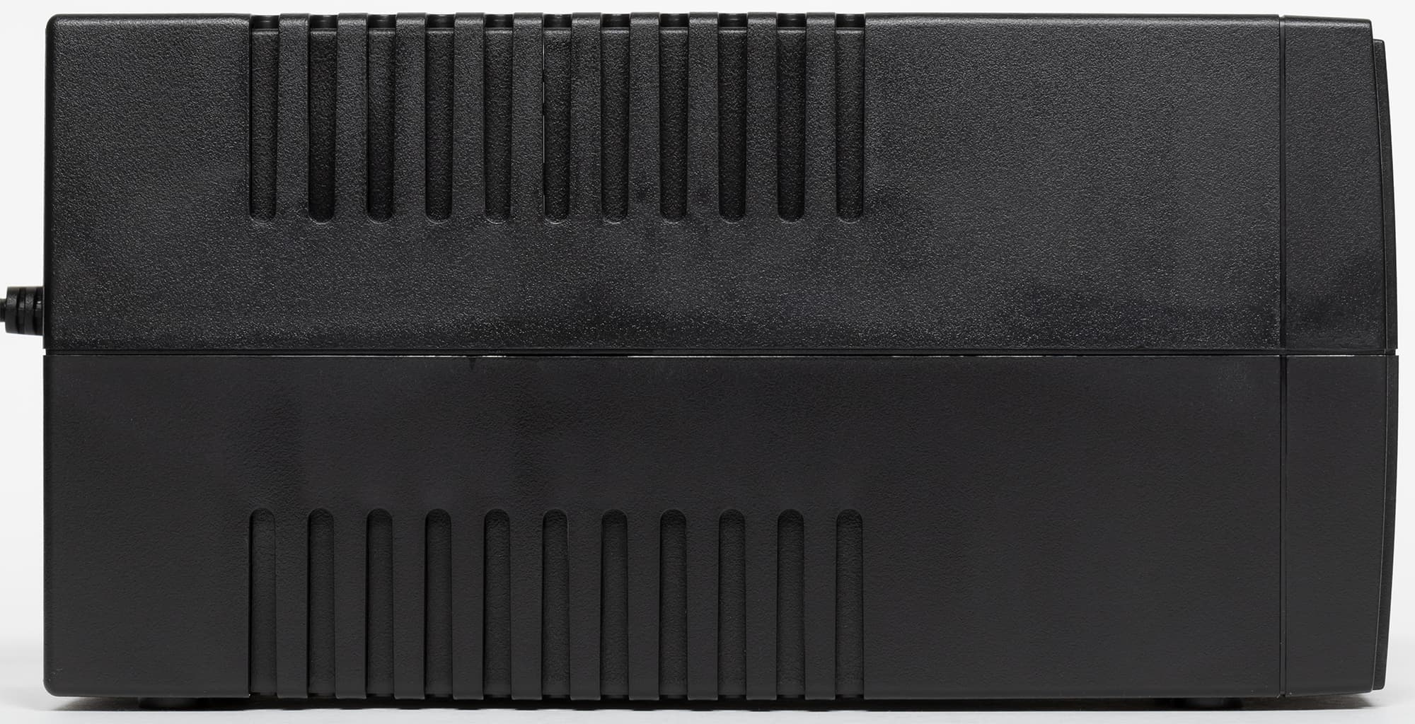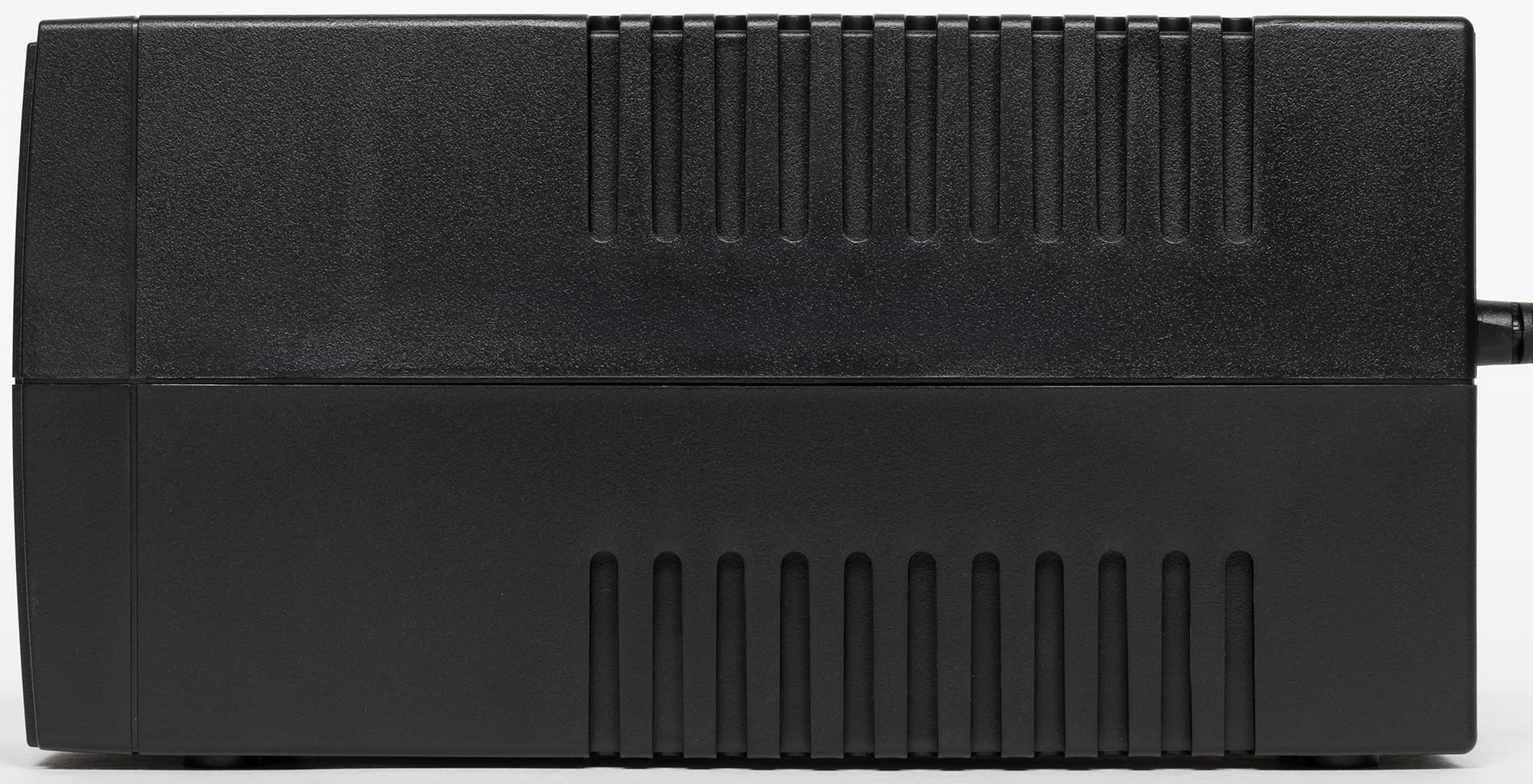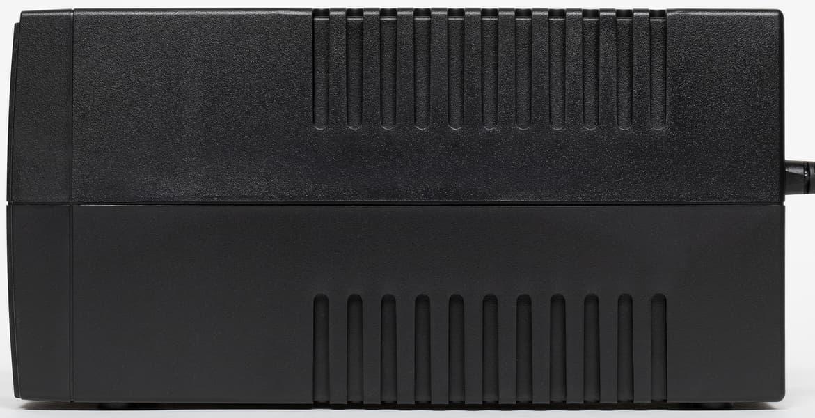Корпус целиком выполнен из пластика матового черного цвета — отсутствие металлических внешних деталей и шасси стало уже стандартом для относительно небольших ИБП, включая более мощные и дорогие.