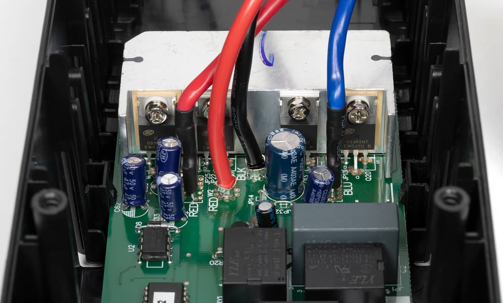 В любом режиме источники нагреваются — не очень сильно, но заметно. Например, во время заряда батареи при выключенном ИБП температура в самой горячей точке корпуса (середина верхней крышки, над радиатором транзисторов инвертора) может быть до 16-17 градусов выше, чем у окружающей среды. При автономной работе с малыми и средними нагрузками, которая длится достаточно долго, нагрев даже чуть меньше: на 14-15 градусов. При больших нагрузках источник отключается довольно быстро (от десятков секунд до нескольких минут), за такое время внешние части корпуса просто не успевают сколь-нибудь существенно нагреться, хотя радиатор транзисторов становится горячим. При близких к максимуму нагрузках потребляемый от батареи ток может превысить 90 ампер, хоть и на короткое время, при этом нагреваются даже довольно толстые провода, идущие от АКБ.